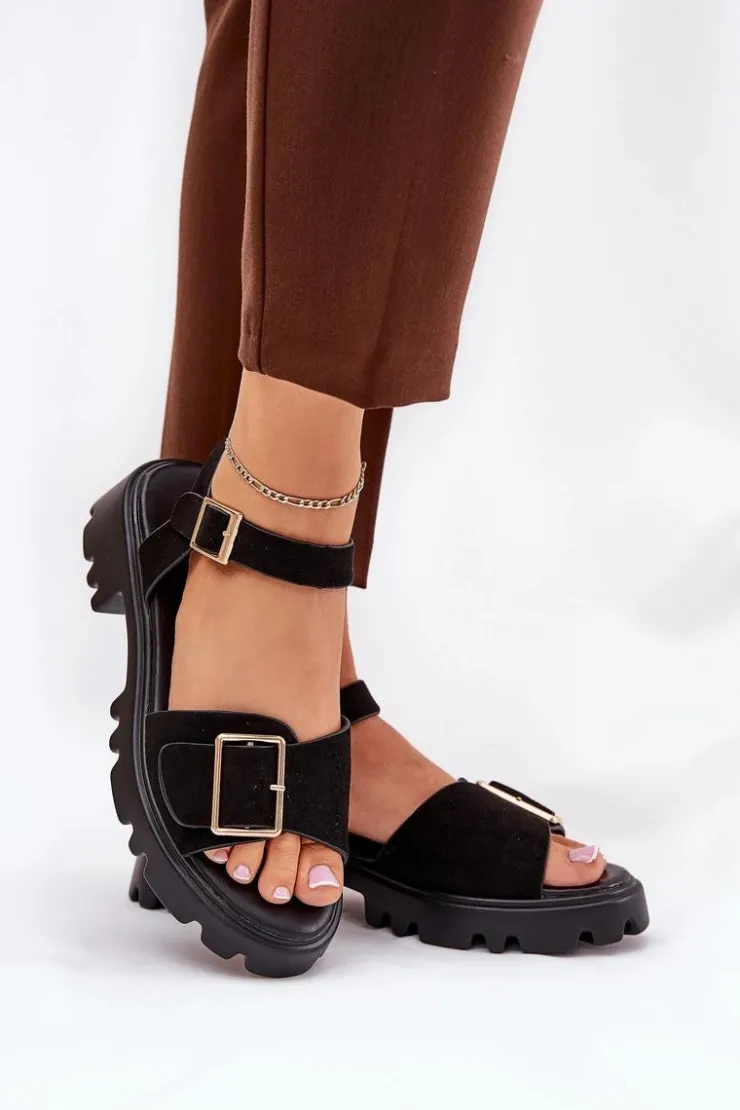 Eleganckie sandały damskie wykonane z eko zamszu, osadzone na platformie oraz płaskim obcasie, które zapewniają wygodę i stabilność. Z przodu buty ozdobione zostały dużą złotą klamrą, która dodaje im subtelnej elegancji i charakteru. Zapinane na regulowany pasek ze sprzączką, co pozwala na idealne dopasowanie do stopy. Te sandały to doskonały wybór na ciepłe dni, pasujące zarówno do sukienek, jak i spodni, łącząc styl i komfort w każdej stylizacji. Przy wyborze rozmiaru prosimy sugerować się tabelą rozmiarów.