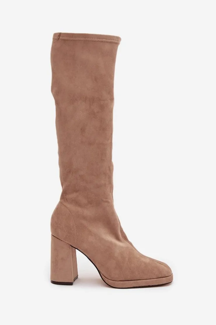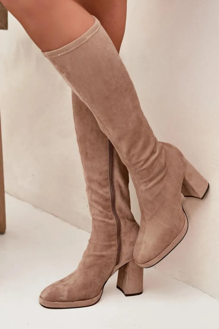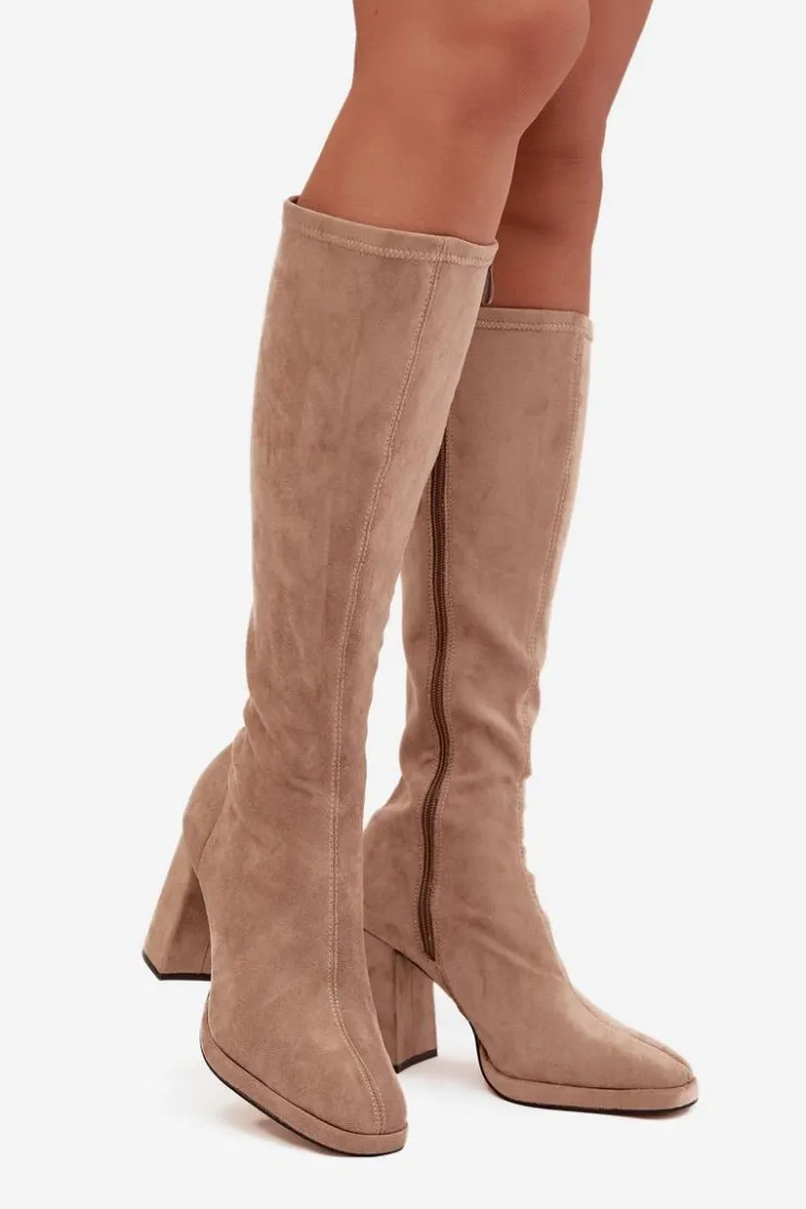 Kozaki damskie wykonane z miękkiego eko zamszu. Stabilny obcas w formie słupka zapewnia komfort noszenia, a delikatnie zaokrąglone noski dodają całości subtelnego charakteru. Model zapinany na zamek. Przylegająca cholewka ozdobiona przeszyciami pięknie podkreśla linię nóg, tworząc smukłą i kobiecą sylwetkę. Doskonałe zarówno do codziennych, jak i eleganckich stylizacji z sukienkami i spódnicami. Przy wyborze rozmiaru prosimy sugerować się tabelą rozmiarów.