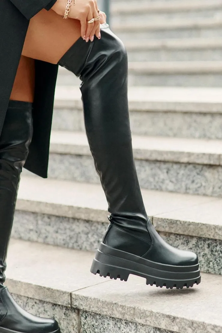 Kozaki za kolano osadzone na masywnej platformie to stylowy wybór na chłodniejsze dni. Model wsuwany, z dodatkowym suwakiem na dole cholewki, co ułatwia zakładanie i dopasowanie. Ocieplane wyłącznie na poziomie stopy, zapewniają ciepło i komfort noszenia. Modny fason, który doda charakteru każdej stylizacji. Przy wyborze rozmiaru prosimy sugerować się tabelą rozmiarów.