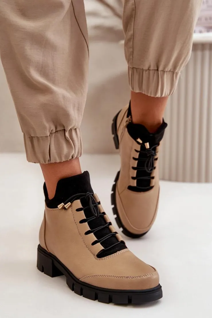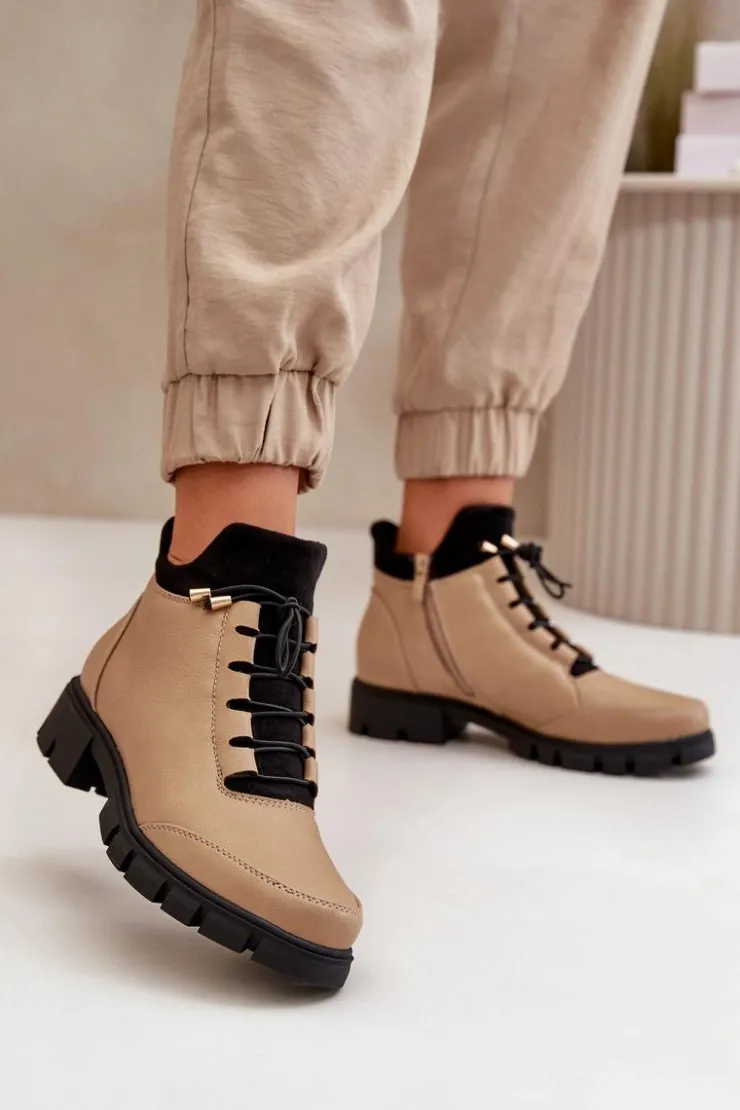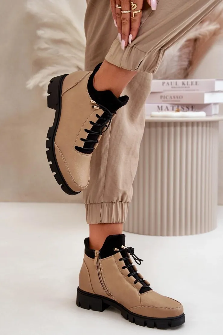 Botki damskie od marki Jezzi. Wykonane z eko skóry. Niska cholewka sięgająca za kostkę. Osadzone na płaskim obcasie. Zapinane na zamek oraz dodatkowo posiadają sznurowanie, co pozwala na idealne dopasowanie do stopy. Środek ocieplony miłym w dotyku kocem obuwniczym. Klasyczny fason do casualowych stylizacji! Przy wyborze rozmiaru prosimy sugerować się tabelą rozmiarów.