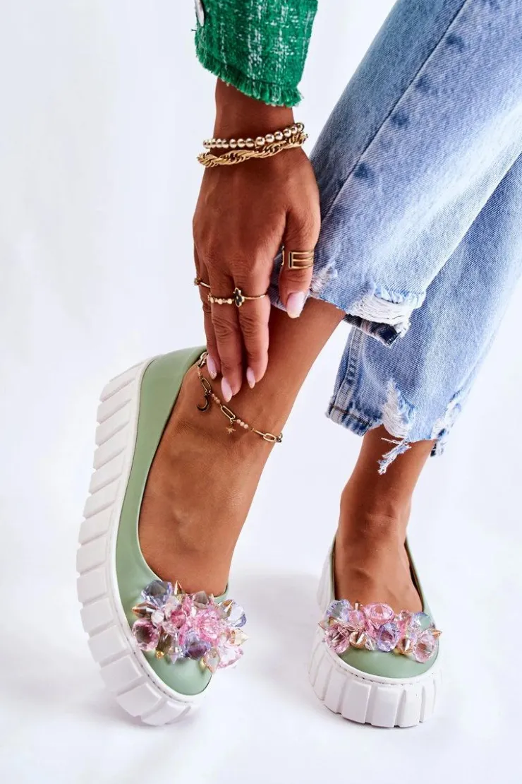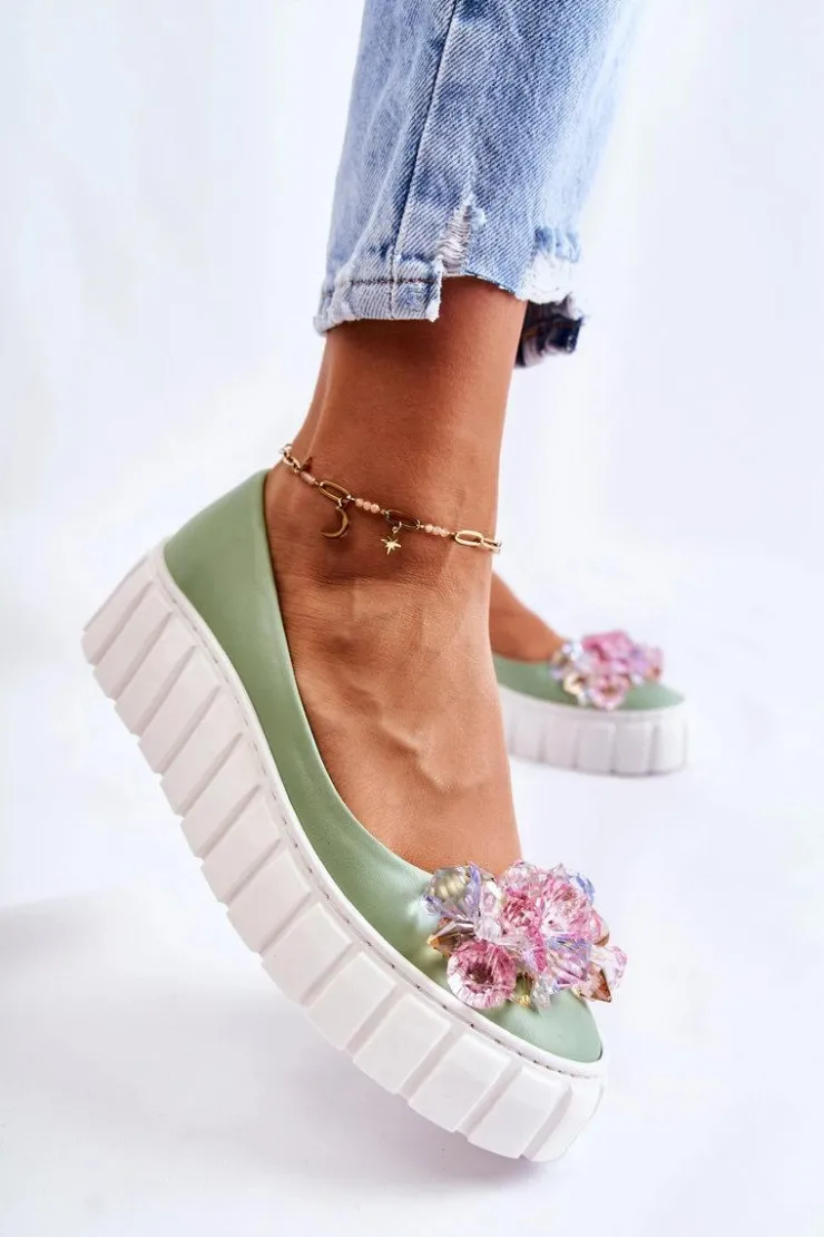Damskie baleriny wykonane z naturalnej skóry z dbałością o każdy detal. O komfort zadba miękka, skórzana wkładka. Podeszwa wykonana z gumowego tworzywa ze żłobieniami po bokach. Dodatkowo jest antypoślizgowa. Zapiętek jest usztywniany. Z przodu elegancka ozdoba w postaci imitacji kryształków doda tym butom uroku. Nosek zaokrąglony. Baleriny dopełnią wiele Twoich stylizacji. Przy wyborze rozmiaru prosimy sugerować się tabelą rozmiarów.