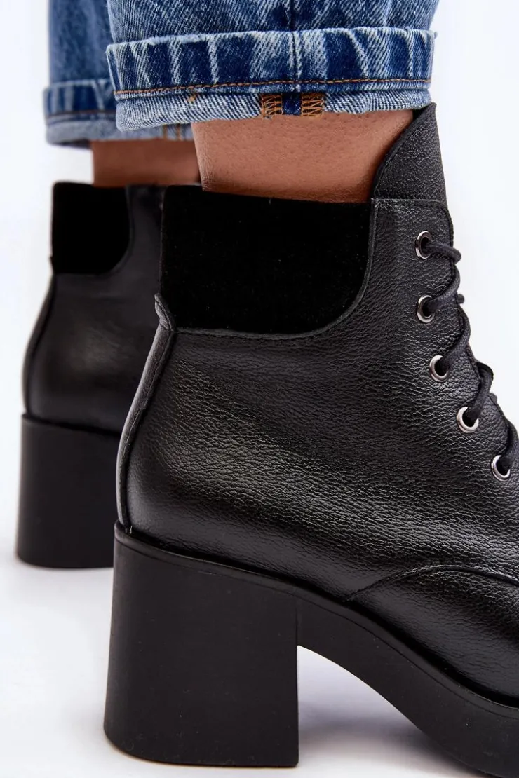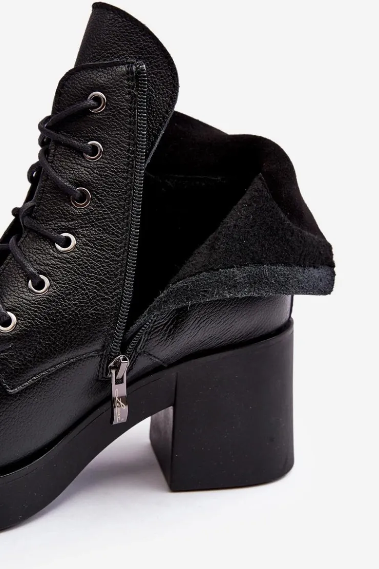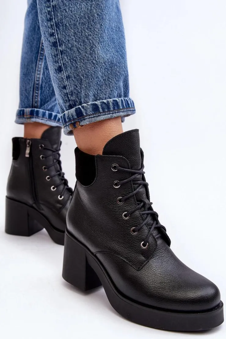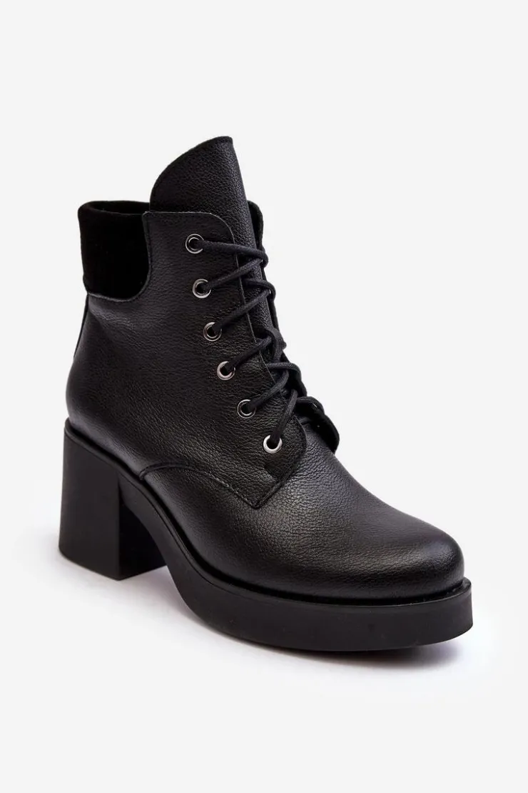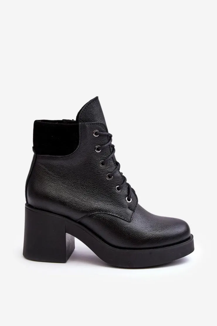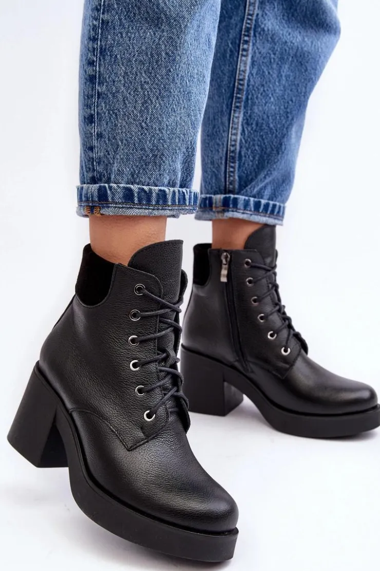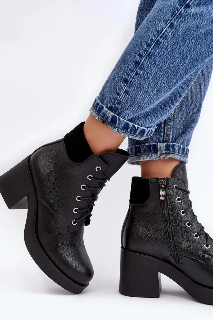 Damskie botki z cholewką za kostkę. Wykonane z wysokiej jakości skóry naturalnej. Osadzone na obcasie w postaci słupka. Wewnątrz ocieplone kocem obuwniczym. Model zapinany na suwak z boku cholewki oraz dodatkowo posiada sznurowanie. Środek lekko ocieplony kocem obuwniczym. Zapiętek w tym obuwiu jest usztywniony. Noski zaokrąglone. Przy wyborze rozmiaru prosimy kierować się tabelą rozmiarów.