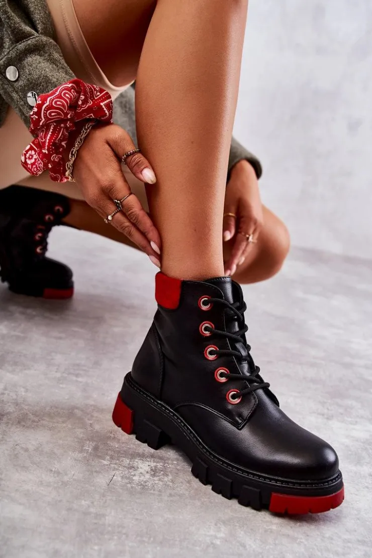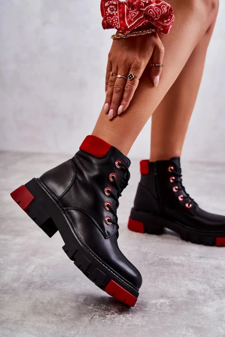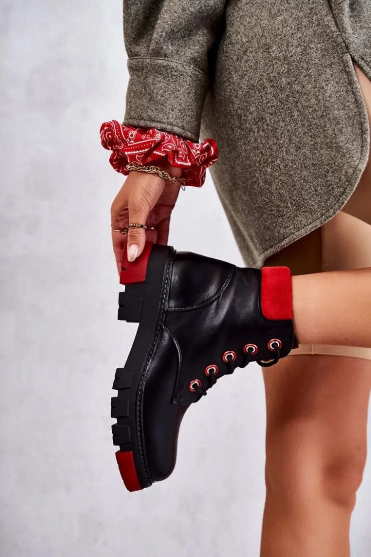 Botki damskie zostały wykonane z eko skóry ze wstawką u góry cholewki z miękkiej tkaniny. Model ten posiada usztywniany zapiętek. Botki są sznurowane oraz zapinane na suwak. Osadzone na platformie i płaskim obcasie. Środek został ocieplony kocem obuwniczym. Koniecznie sprawdź także pozostałe modele botków dostępne na naszej stronie! Przy wyborze rozmiaru prosimy sugerować się tabelą rozmiarów.