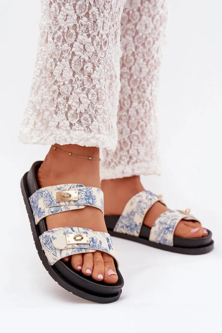 Wzorzyste klapki damskie wykonane z materiału tekstylnego, osadzone na platformie, to stylowa propozycja na letnie dni. Model wyróżnia się dwoma paskami ozdobionymi złotymi elementami, które dodają im wyjątkowego charakteru. Idealne do codziennych stylizacji, świetnie komponują się z sukienkami, spódnicami czy szortami, zapewniając modny wygląd. Przy wyborze rozmiaru prosimy sugerować się tabelą rozmiarów.