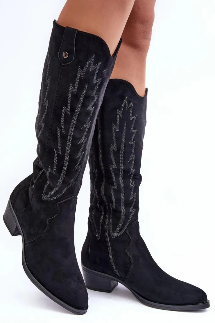 Ten model skradnie serce niejednej miłośniczce kozaków w stylu kowbojek! Świetnie sprawdzą się podczas jesiennych stylizacji! Model wykonany z miłego eko zamszu z delikatnymi przeszyciami na cholewce. Kozaki zapinane są na suwak. Osadzone na niskim, stabilnym obcasie. Ocieplone wewnątrz kocem obuwniczym. Nosek w szpic optycznie wysmukli nogi. Kozaki posiadają usztywniany zapiętek. Przy wyborze rozmiaru prosimy sugerować się tabelą rozmiarów.