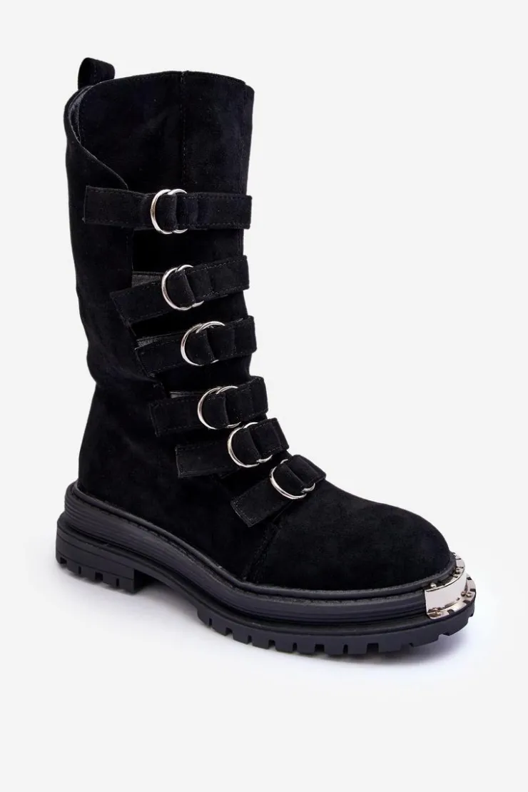 Wysokie workery damskie osadzone na płaskim obcasie oraz platformie. Zapinane na suwak po wewnętrznej stronie cholewki. Wykonane z eko zamszu. Noski zaokrąglone. Z przodu regulowane paseczki. Usztywniony zapiętek pozwoli na odpowiednią stabilizację stopy. Środek ocieplony kocem obuwniczym. Przy wyborze rozmiaru prosimy sugerować się tabelą rozmiarów.