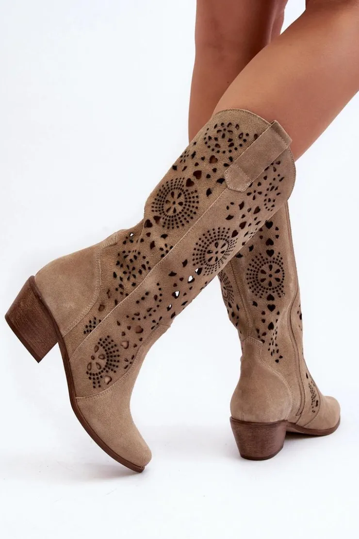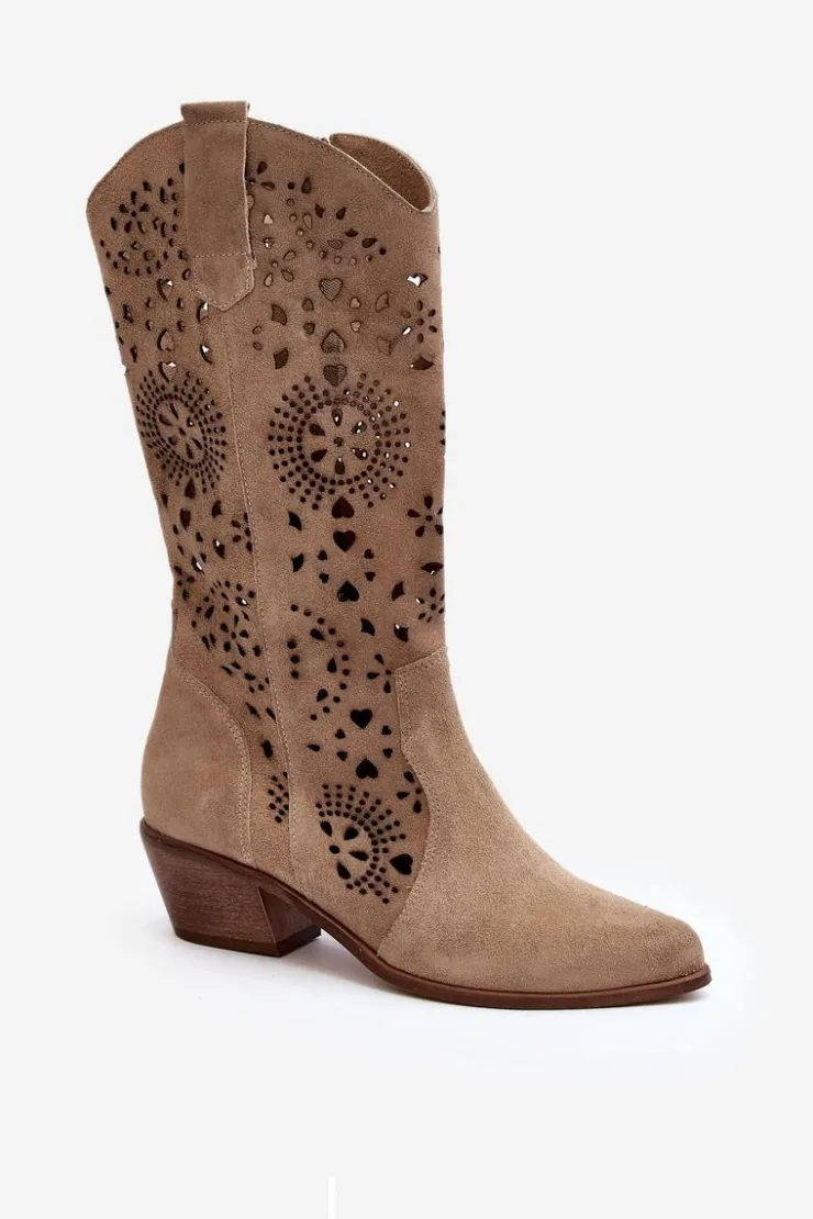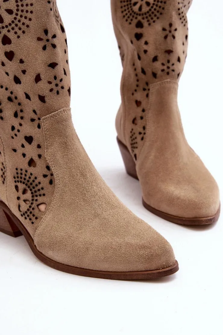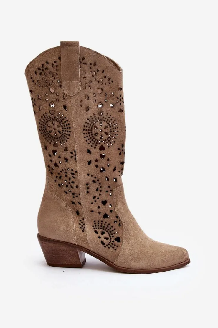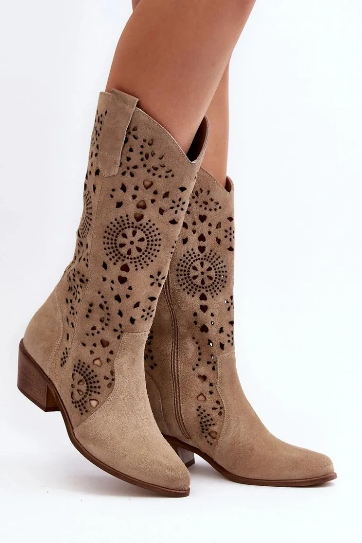 Kozaki z ażurową cholewką do połowy łydki. Model w stylu kowbojek. Zapinane na suwak. Noski w szpic optycznie wysmuklą nogi. Miękka, skórzana wkładka zapewni wygodę podczas użytkowania. Ażurowe kozaki to idealny wybór do wielu stylizacji! Przy wyborze rozmiaru prosimy sugerować się tabelą rozmiarów.