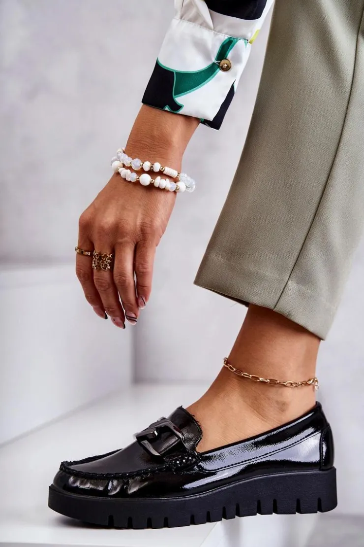 Klasyczne półbuty to doskonały wybór w stylizacjach do pracy. Świetnie prezentują się zarówno ze spodniami, jak i ze spódniczką. Zdobienie z tworzywa sztucznego pięknie podkreśla całość. Buty posiadają masywną podeszwę z wyraźnym wyżłobieniem. Lakierowana eko skóra o praktyczny wybór na co dzień. Półbuty Loafery to buty, które muszą znaleźć się w Twojej szafie! Przy wyborze rozmiaru prosimy sugerować się tabelą rozmiarów.