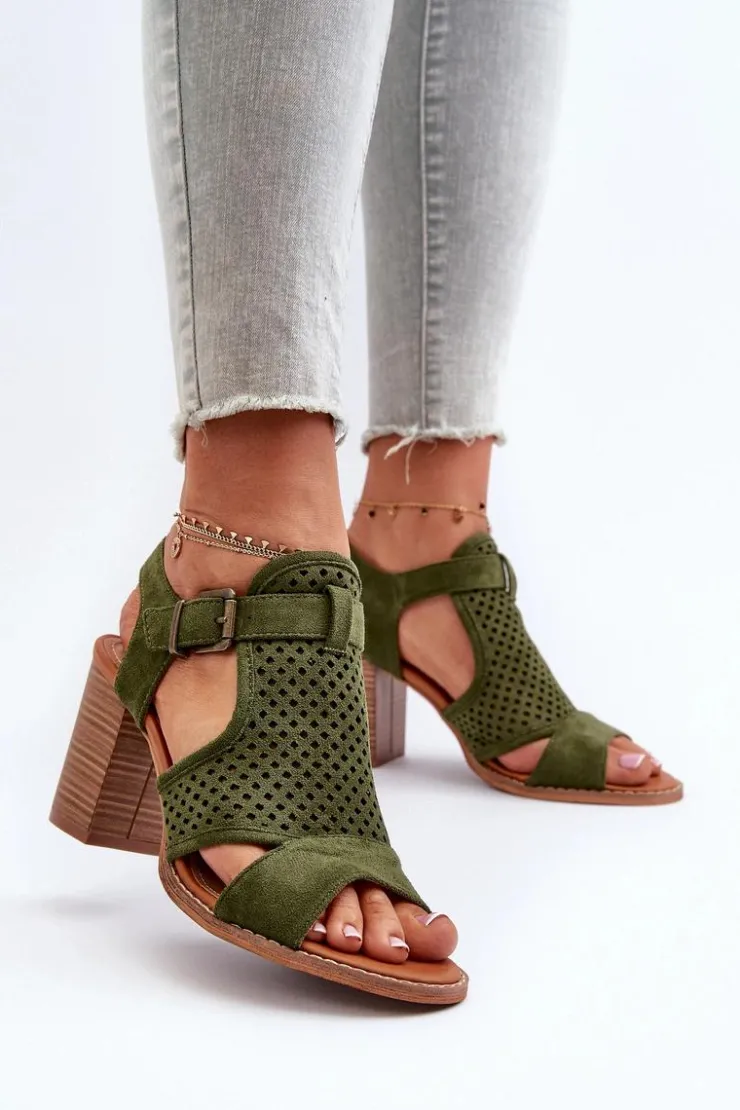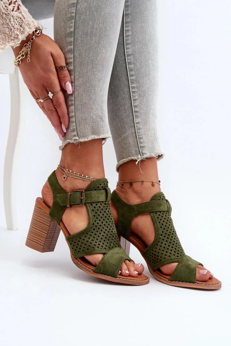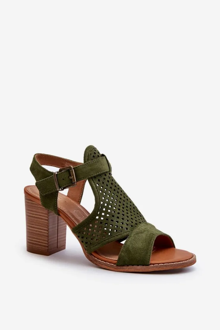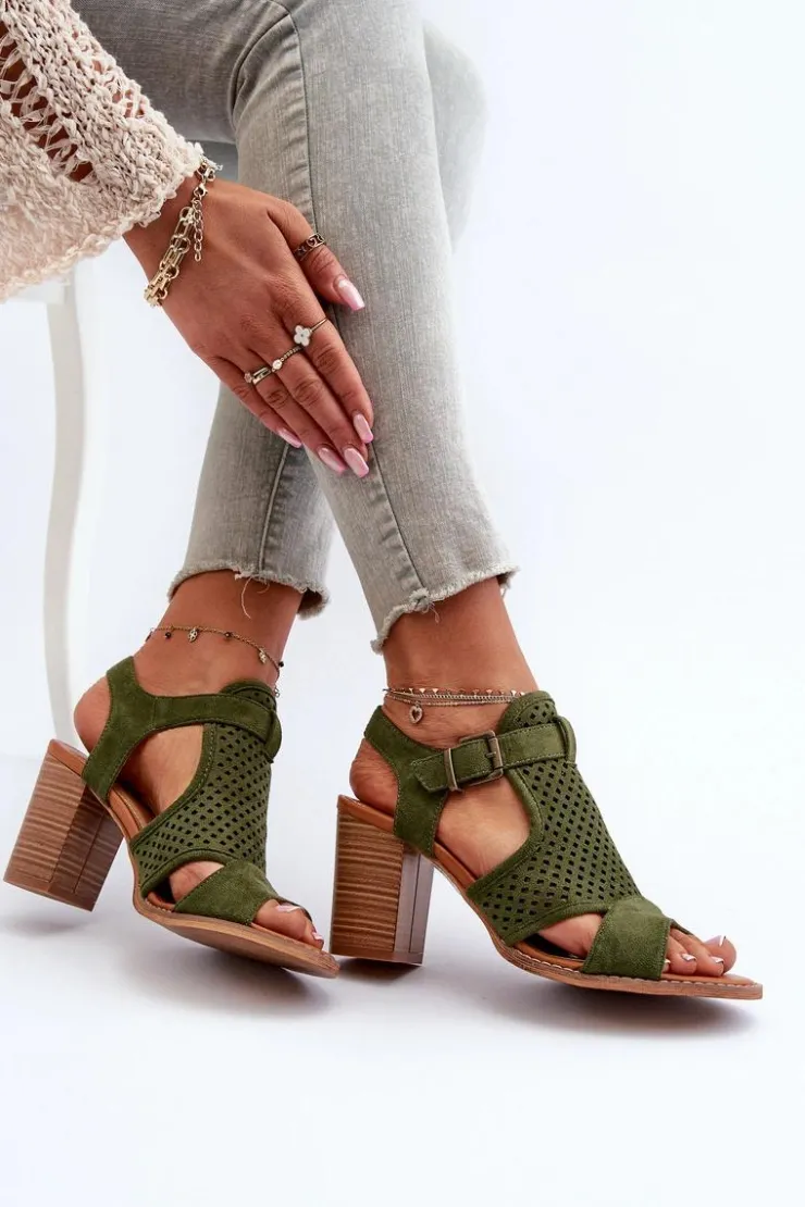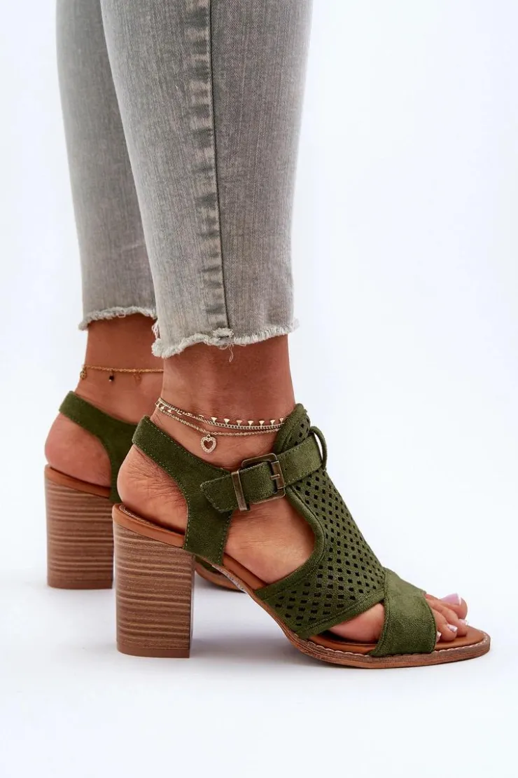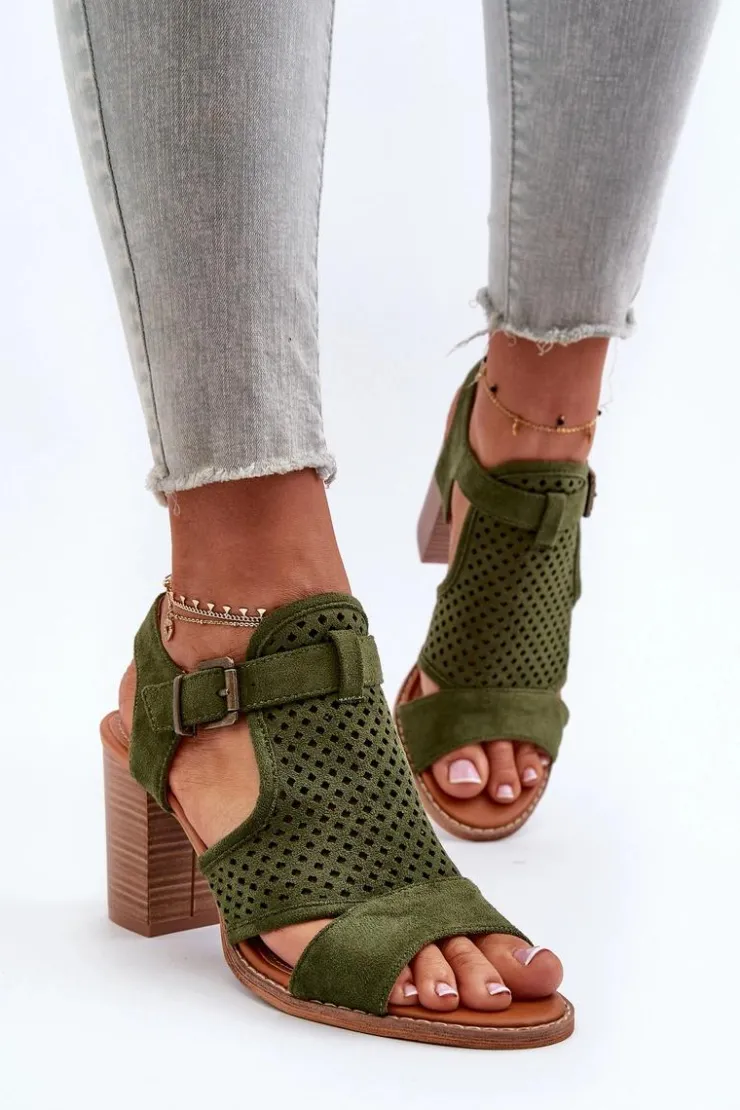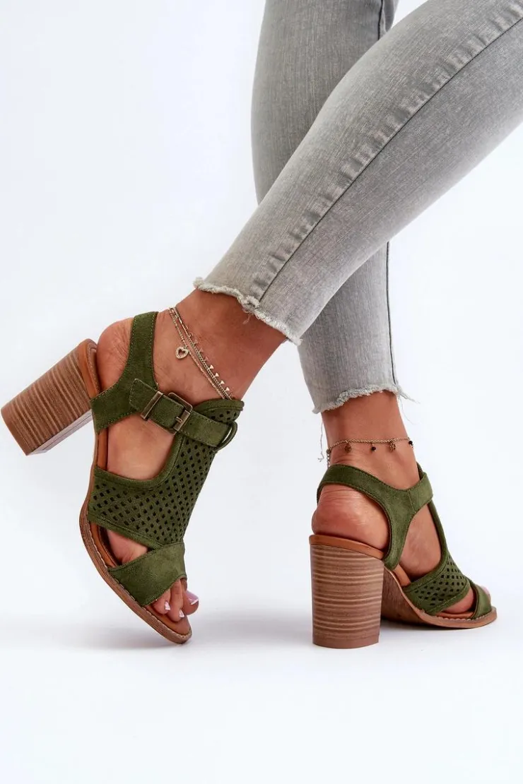Piękne i wygodne sandały na słupku. Buty wykonane są z wysokiej jakości zamszowej eko skóry. O Twój komfort zadba miękka cholewka oraz wkładka ze skóry naturalnej. Modny kolor i drewniany słupek urozmaicą wszystkie Twoje stylizacje. Koniecznie sprawdź całą naszą kolekcję damskich sandałów! Przy wyborze rozmiaru prosimy kierować się tabelą rozmiarów.