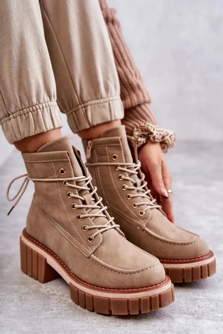 Wyjątkowe trapery damskie świetnie sprawdzą się w sezonie jesienno-zimowym. Wykonane z wysokiej jakości eko skóry. Modne przeszycia na cholewce. Botki osadzone na masywnej platformie i płaskim obcasie ze żłobieniami po bokach oraz obszytą nicią podeszwą. Ocieplone miłym w dotyku kocem obuwniczym. Podeszwa jest antypoślizgowa. Przy wyborze rozmiaru prosimy sugerować się tabelą rozmiarów.