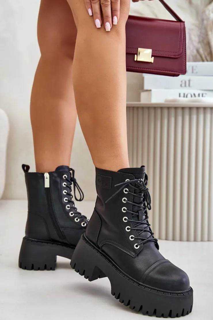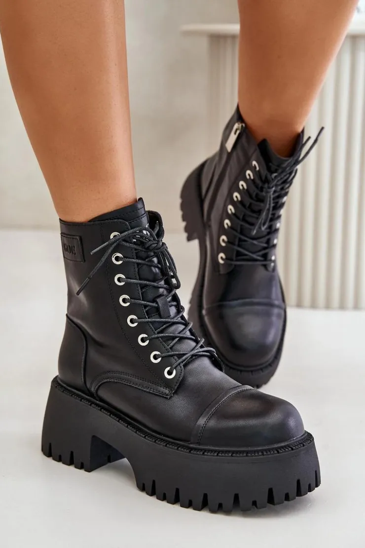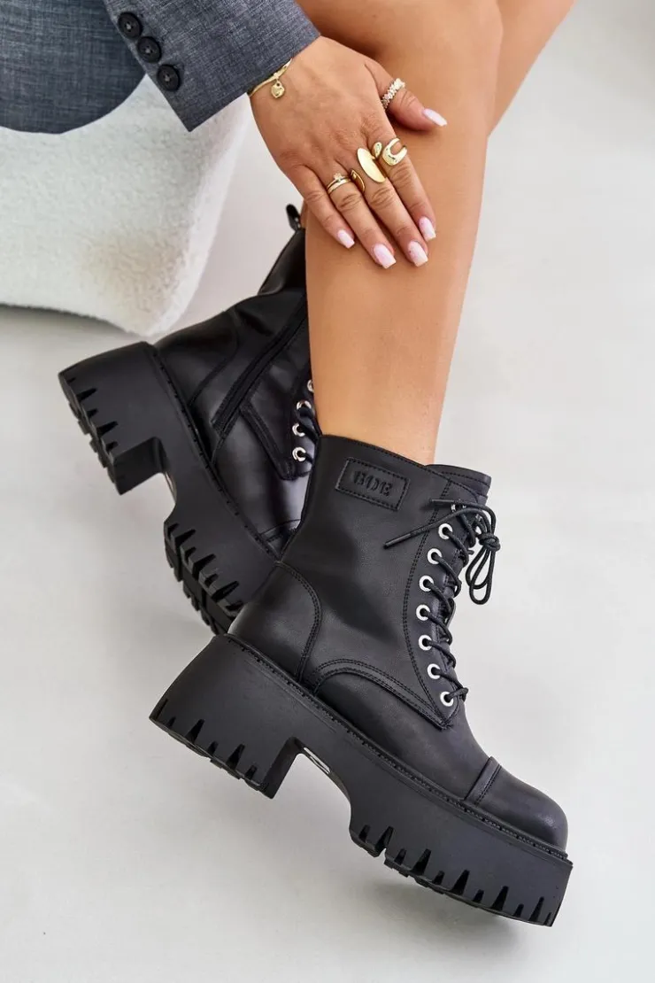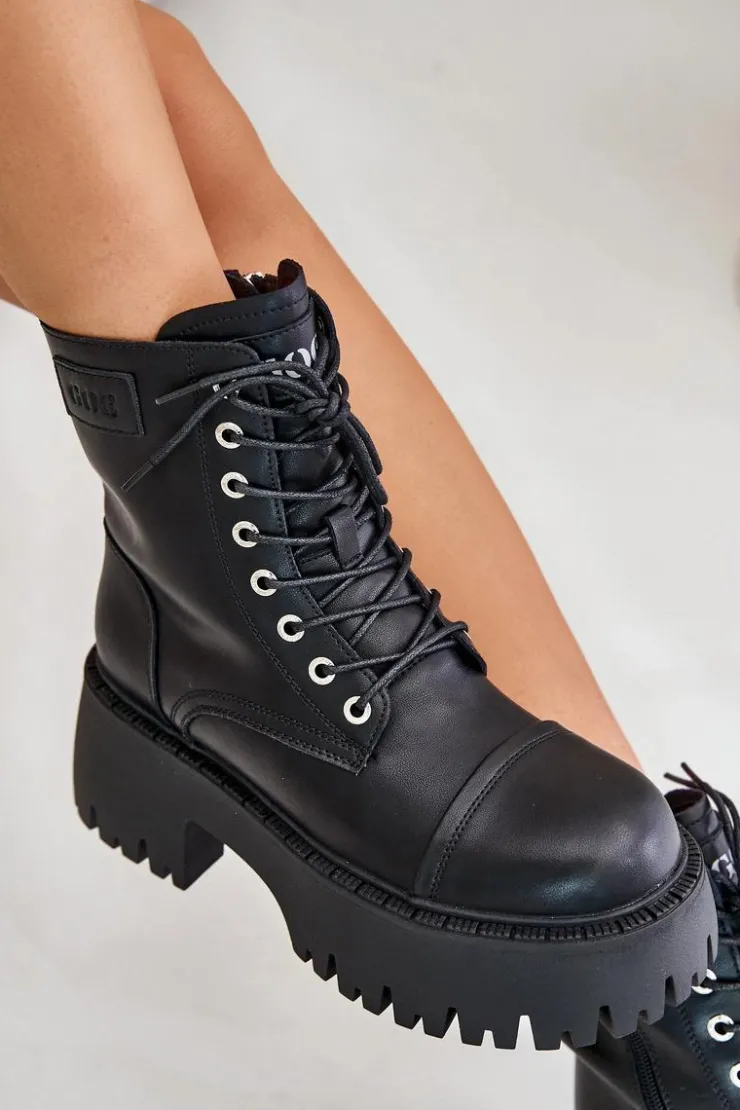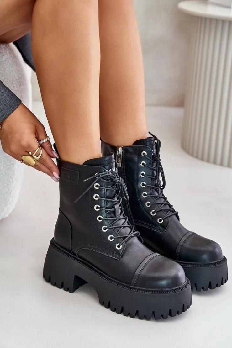 Botki od marki Goe to propozycja dla kobiet ceniących nowoczesny styl i wygodę. Wykonane ze skóry naturalnej. Osadzone na masywnej platformie i płaskim obcasie, zapewniają komfort i stabilność na każdym kroku. Model zapinany na zamek oraz sznurowany, co ułatwia dopasowanie do stopy. Zaokrąglone noski dodają im subtelnego wyglądu, idealnego do codziennych stylizacji. Przy wyborze rozmiaru prosimy kierować się tabelą rozmiarów