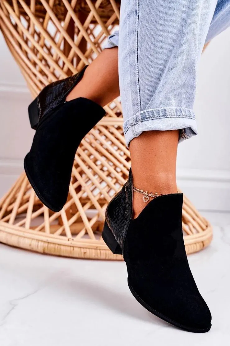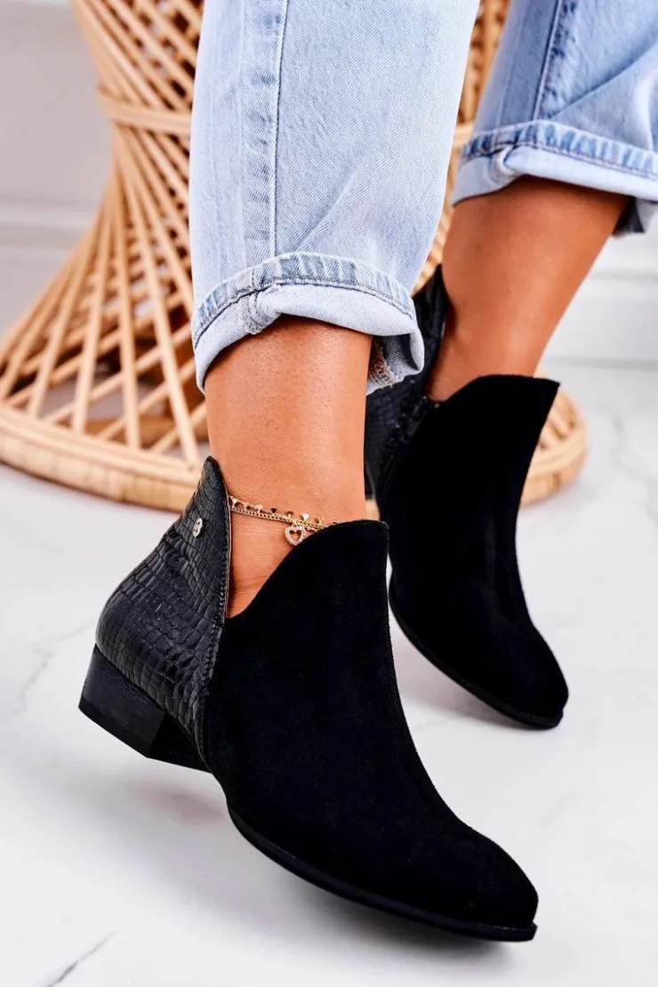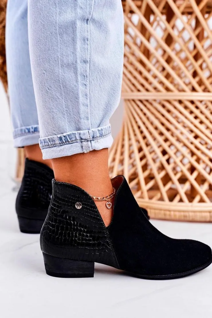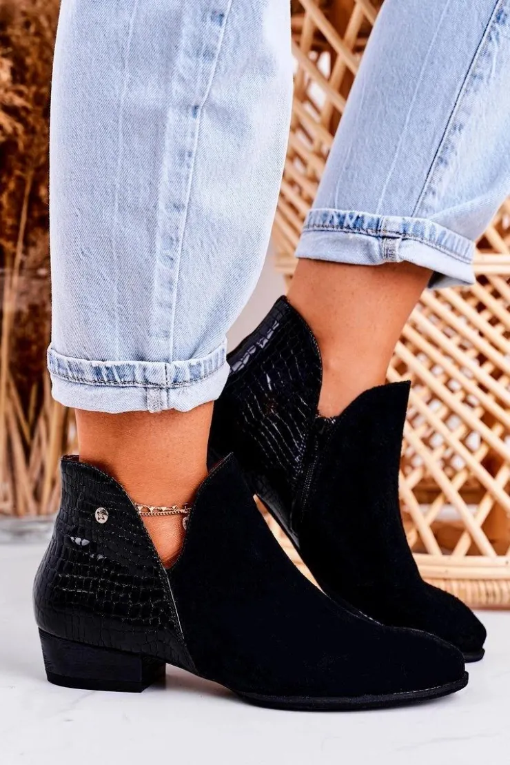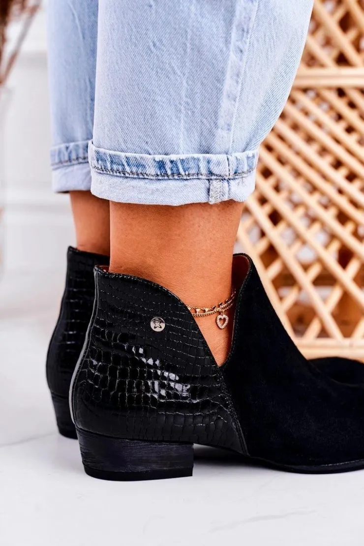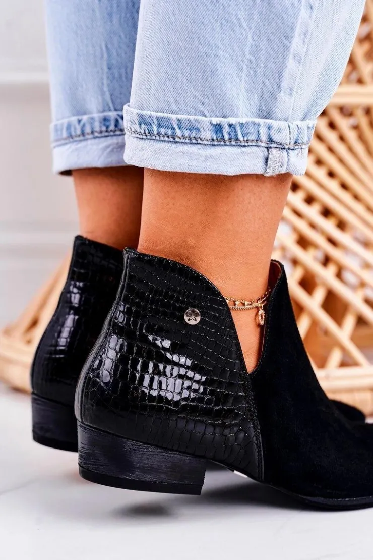 Sale Maciejka Damskie Skórzane Botki Lakierowane Czarne Wzór Zwierzęcy 04091-72