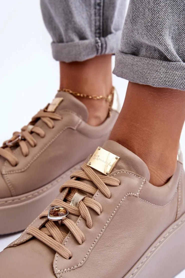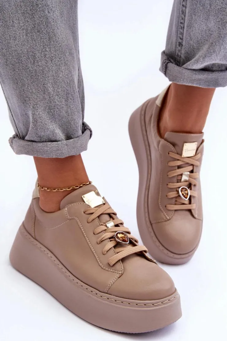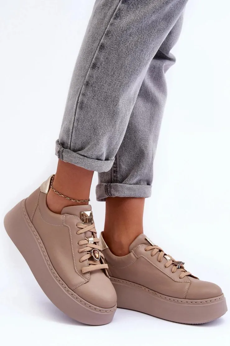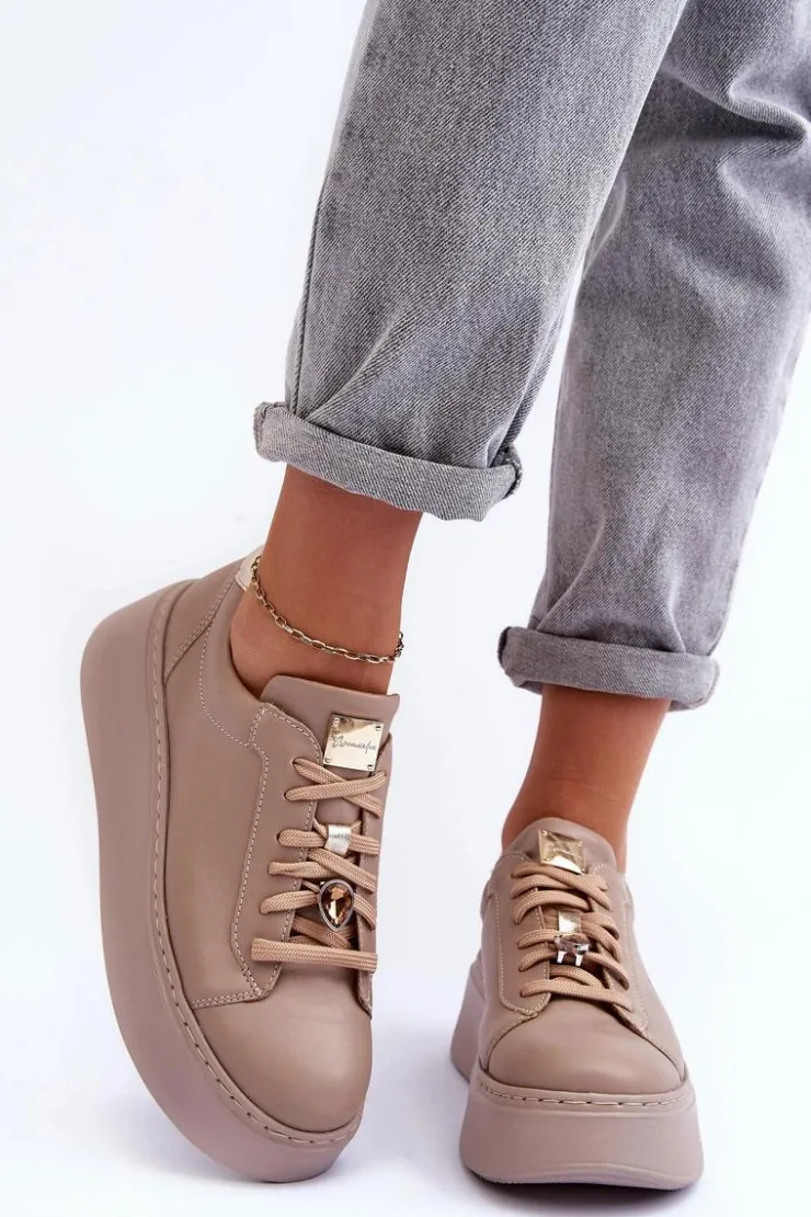Buty sportowe marki Maciejka. Wykonane z naturalnej skóry z dbałością o szczegóły. Osadzone na masywnej platformie. Model klasycznie sznurowany z usztywnionym zapiętkiem. Noski zaokrąglone. Miękka, wkładka zapewni komfort podczas użytkowania. Na sznurówkach przypięta jest mała, biżuteryjna ozdoba. Przy wyborze rozmiaru prosimy sugerować się tabelą rozmiarów.