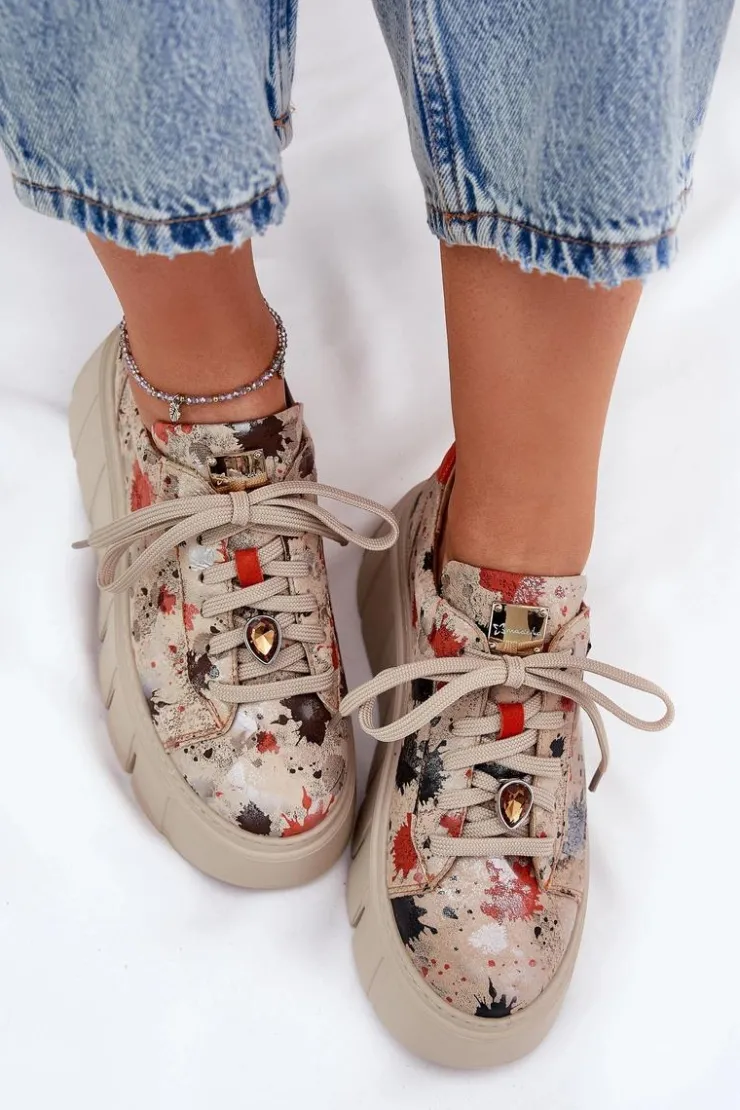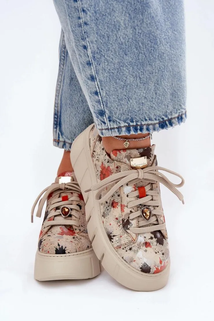 Sneakersy od marki Maciejka. Wykonane z naturalnej skóry, łączą komfort z modnym designem. Wzorzysta cholewka dodaje im charakteru, a platforma zapewnia stabilność i wygodę. Sznurowanie wzbogacone o przypinkę nadaje unikalnego stylu. Te sneakersy to doskonały wybór dla osób, które szukają wygody i oryginalności! Przy wyborze rozmiaru prosimy sugerować się tabelą rozmiarów.