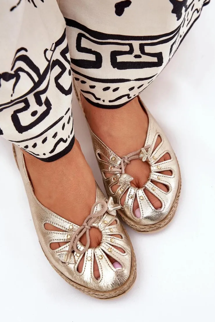 Płaskie baleriny z naturalnej skóry to elegancka i komfortowa propozycja na co dzień. Model ten wyróżnia subtelne wiązanie oraz wycięcia, co nadaje im delikatnego, kobiecego charakteru. Te baleriny będą doskonałym wyborem do casualowych stylizacji, łącząc elegancję z komfortem. Przy wyborze rozmiaru prosimy sugerować się tabelą rozmiarów.