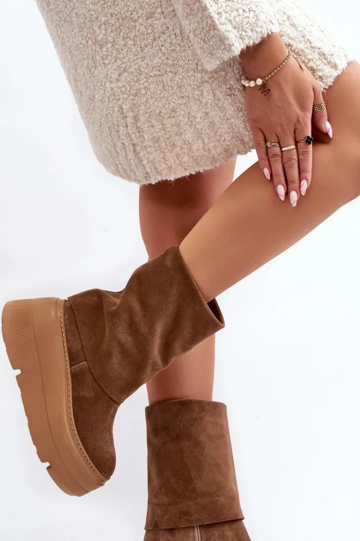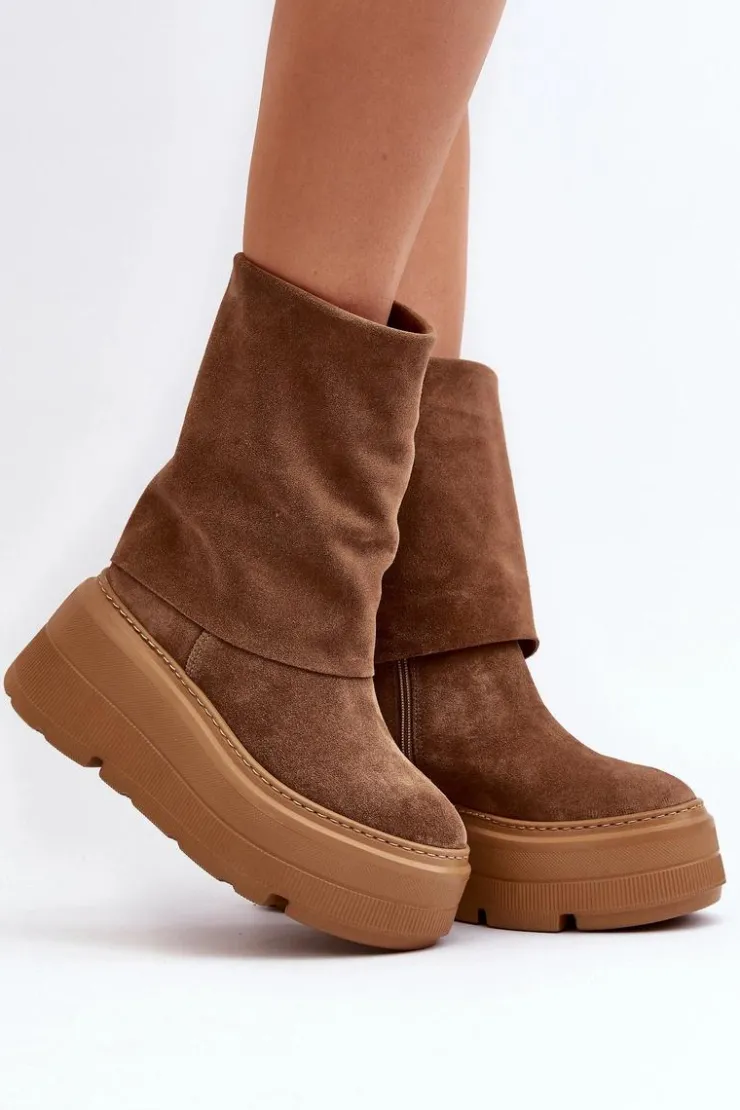 Botki damskie wykonane z naturalnego zamszu. Platforma w tym modelu jest wysoka, jednak botki są niezwykle stabilne. Posiadają zapinanie na zamek od wewnętrznej strony. Noski zaokrąglone. Stylowy fason, który z pewnością dopasujesz do niejednej wiosennej stylizacji! Przy wyborze rozmiaru prosimy sugerować się poniższą tabelą rozmiarów.