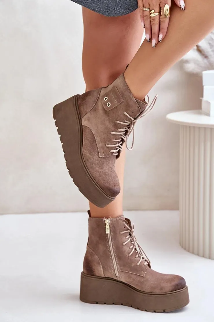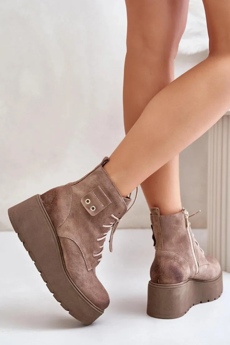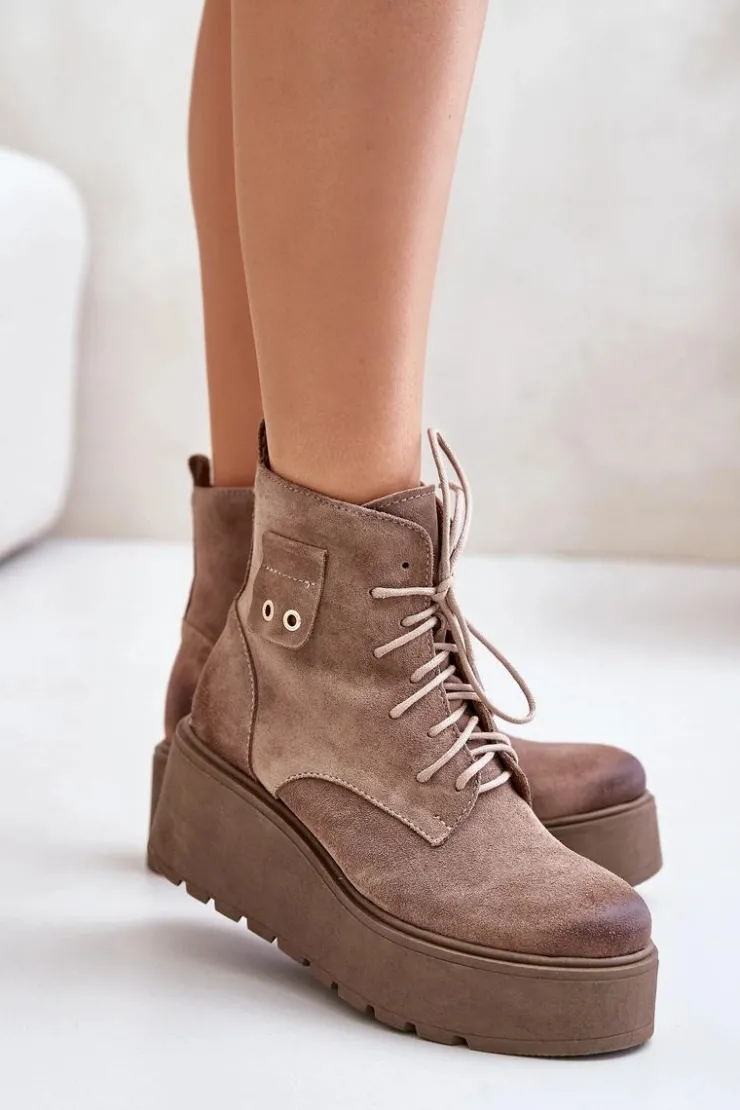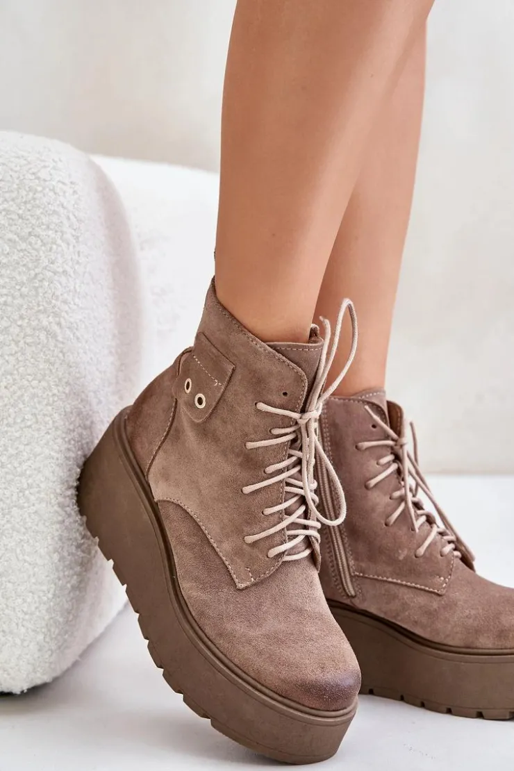 Damskie botki wykonane z naturalnego zamszu to stylowa propozycja na chłodniejsze dni. Osadzone na masywnej platformie z koturnem, zapewniają komfort i stabilność. Zamek z boku cholewki ułatwia zakładanie, a usztywniany zapiętek. Wnętrze ocieplone filcem gwarantuje ciepło, a ozdobny element na cholewce podkreśla ich wyjątkowy charakter. Ten model będzie doskonałym uzupełnieniem różnorodnych stylizacji. Przy wyborze rozmiaru prosimy kierować się tabelą rozmiarów