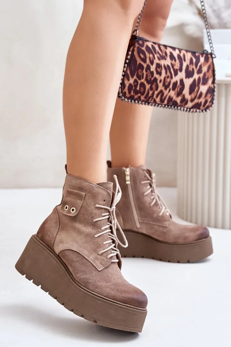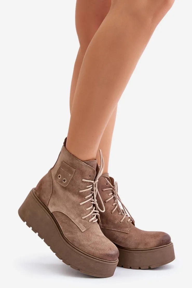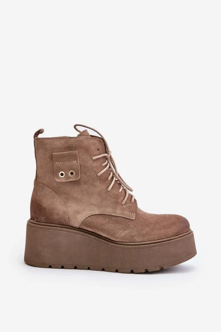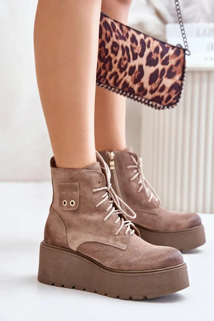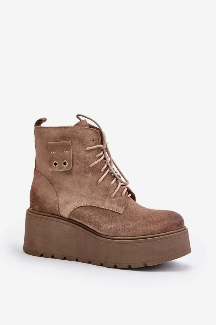 Damskie botki wykonane z naturalnego zamszu to stylowa propozycja na chłodniejsze dni. Osadzone na masywnej platformie z koturnem, zapewniają komfort i stabilność. Zamek z boku cholewki ułatwia zakładanie, a usztywniany zapiętek. Wnętrze ocieplone filcem gwarantuje ciepło, a ozdobny element na cholewce podkreśla ich wyjątkowy charakter. Ten model będzie doskonałym uzupełnieniem różnorodnych stylizacji. Przy wyborze rozmiaru prosimy kierować się tabelą rozmiarów