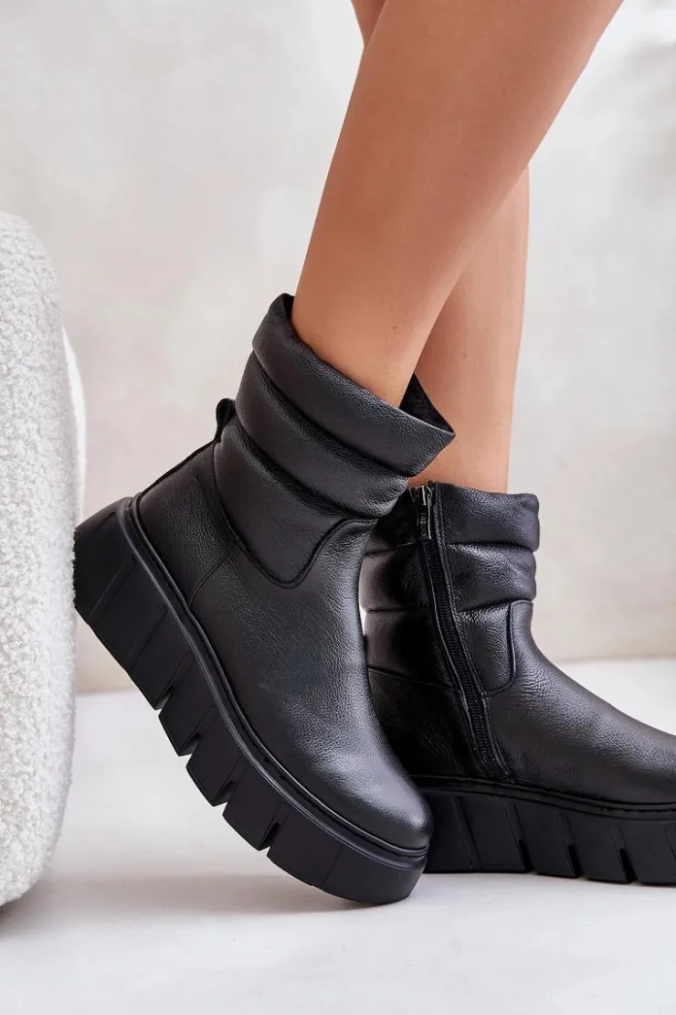 Damskie botki z wysokogatunkowej skóry naturalnej to doskonały wybór na jesień i zimę. Z boku cholewki posiadają praktyczny suwak, który ułatwia ich zakładanie. Osadzone na platformie z delikatnym koturnem, łączą w sobie nowoczesny styl i wygodę. Wnętrze ocieplone filcem zapewnia ciepło, a zaokrąglone noski dodają klasycznego uroku. Ten model z pewnością będzie świetnym dodatkiem do wielu jesienno-zimowych stylizacji. Przy wyborze rozmiaru prosimy kierować się tabelą rozmiarów
