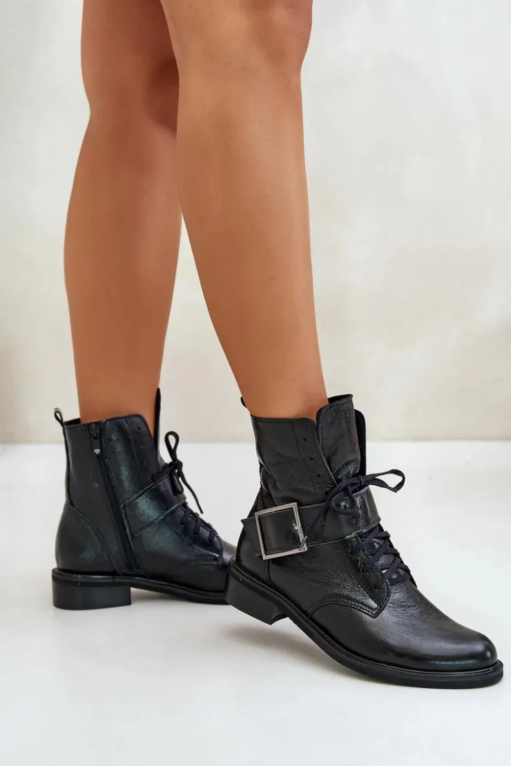 Botki damskie wykonane z wysokiej jakości skóry naturalnej. Zapinane na zamek oraz dodatkowo posiadają sznurowanie. Cholewka ozdobiona paskiem ze srebrną klamrą. Miękka wkładka zapewni komfort podczas użytkowania. Noski zaokrąglone. Usztywniony zapiętek zwiększy stabilizację stopy. Przy wyborze rozmiaru prosimy sugerować się tabelą rozmiarów.