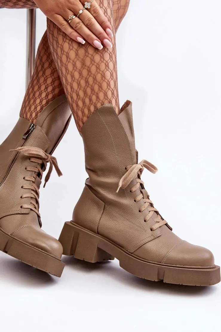 Botki damskie wykonane ze skóry naturalnej. Osadzona na masywnym, płaskim obcasie oraz platformie. Zapinane na suwak. Z przodu sznurowanie. Zapiętek jest usztywniony. Miękka wkładka zapewni komfort podczas użytkowania. Noski zaokrąglone. Ten modny model będzie pasować do wielu jesienno-zimowych stylizacji! Przy wyborze rozmiaru prosimy sugerować się tabelą rozmiarów.