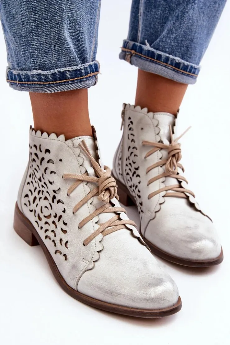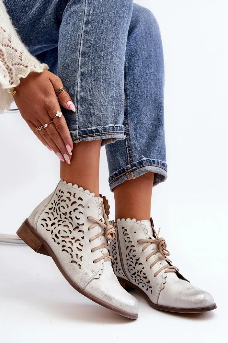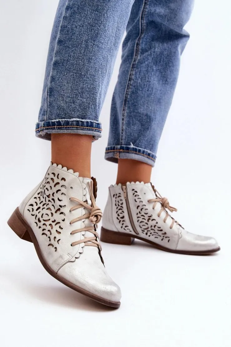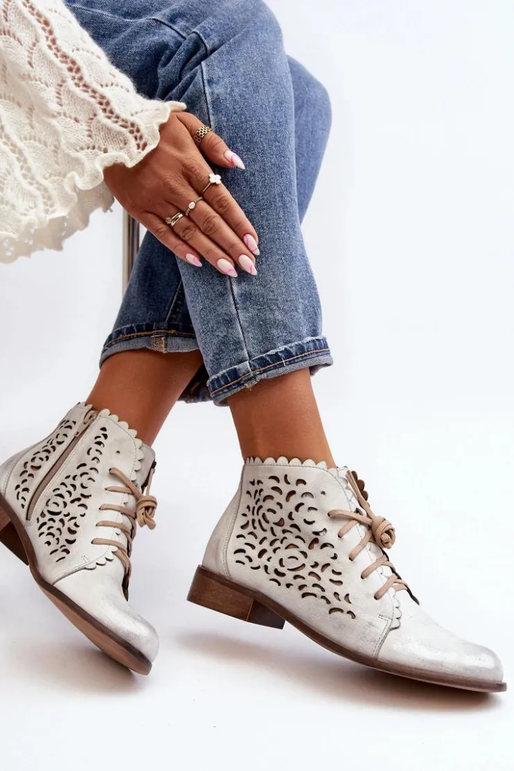 Botki damskie zostały wykonane z wysokiej jakości skóry naturalnej. Osadzone na płaskim obcasie. Cholewka za kostkę. Noski zaokrąglone. Wkładka z naturalnej skóry zapewni komfort podczas użytkowania. Model zapinany na suwak oraz dodatkowo posiada sznurowanie. Idealne do spodni, spódnic i sukienek. Koniecznie powinnaś je mieć! Przy wyborze rozmiaru prosimy sugerować się tabelą rozmiarów.