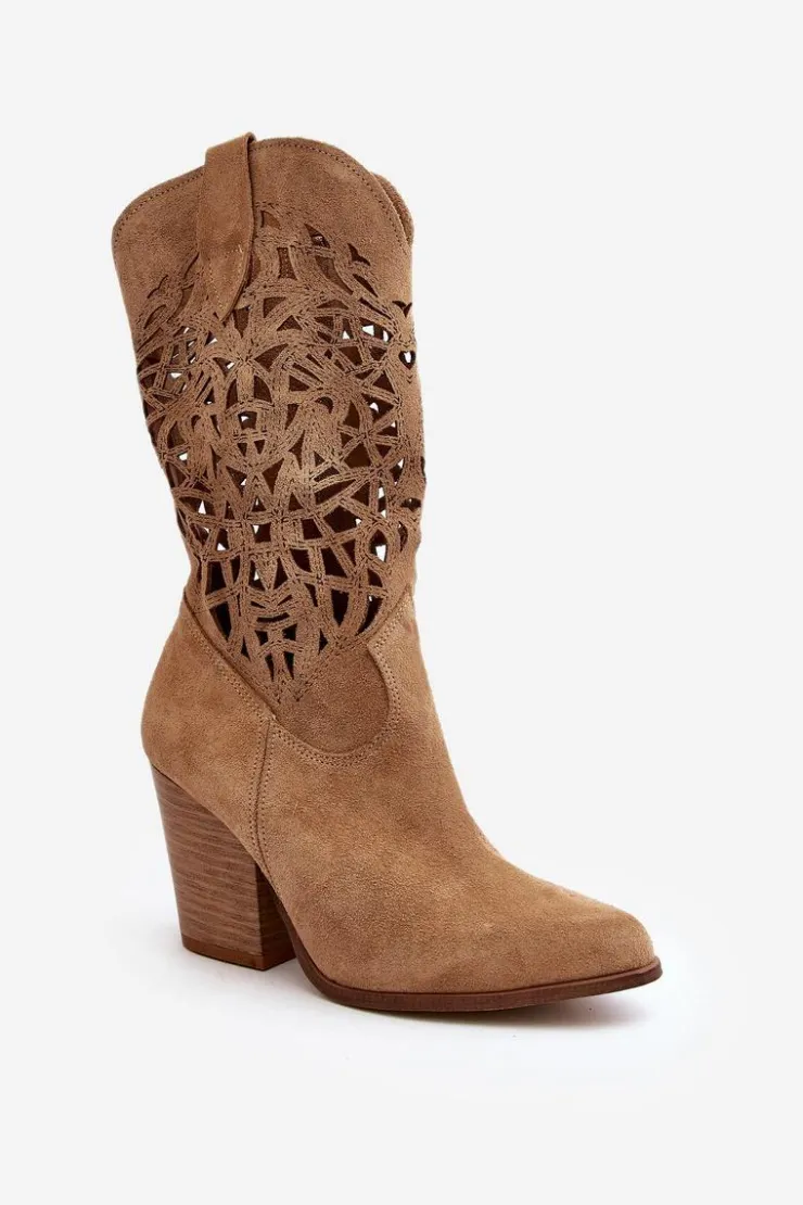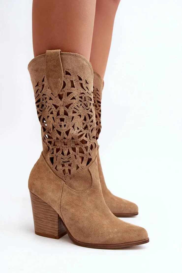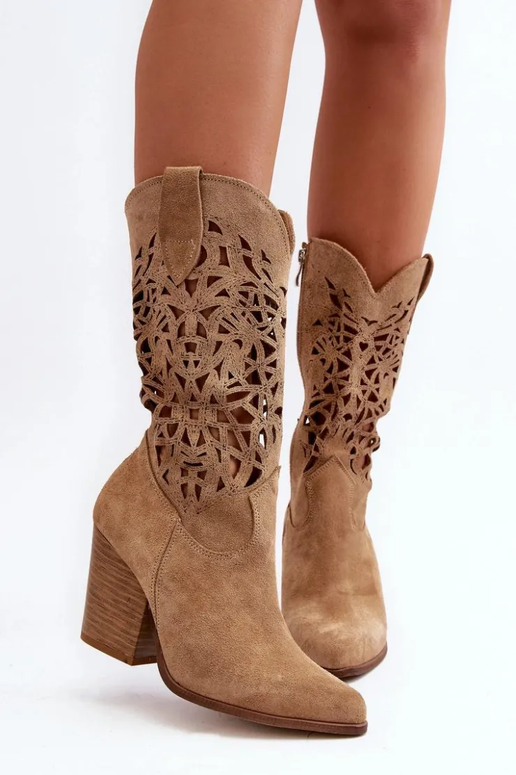 Damskie botki wykonane z naturalnego zamszu. Osadzone na obcasie w postaci słupka. Ażurowy wzorek na cholewce. Zapinane na zamek błyskawiczny. Miękka, niezwykle wygodna wkładka zapewni komfort podczas użytkowania. Noski w szpic optycznie wysmuklą nogi. Koniecznie powinnaś je mieć! Przy wyborze rozmiaru prosimy sugerować się tabelą rozmiarów.
