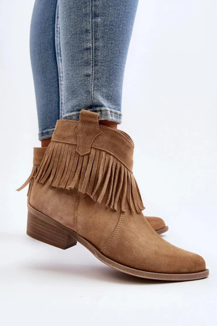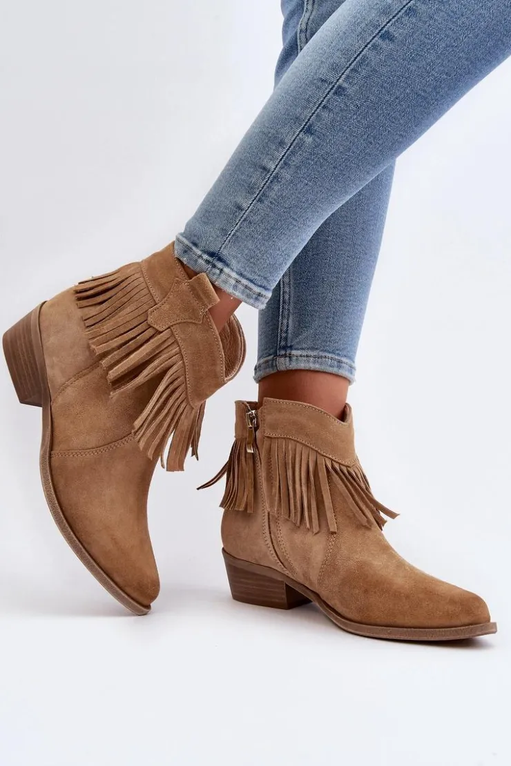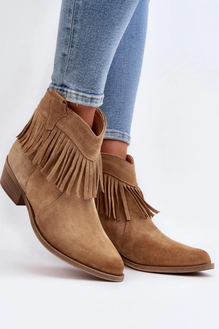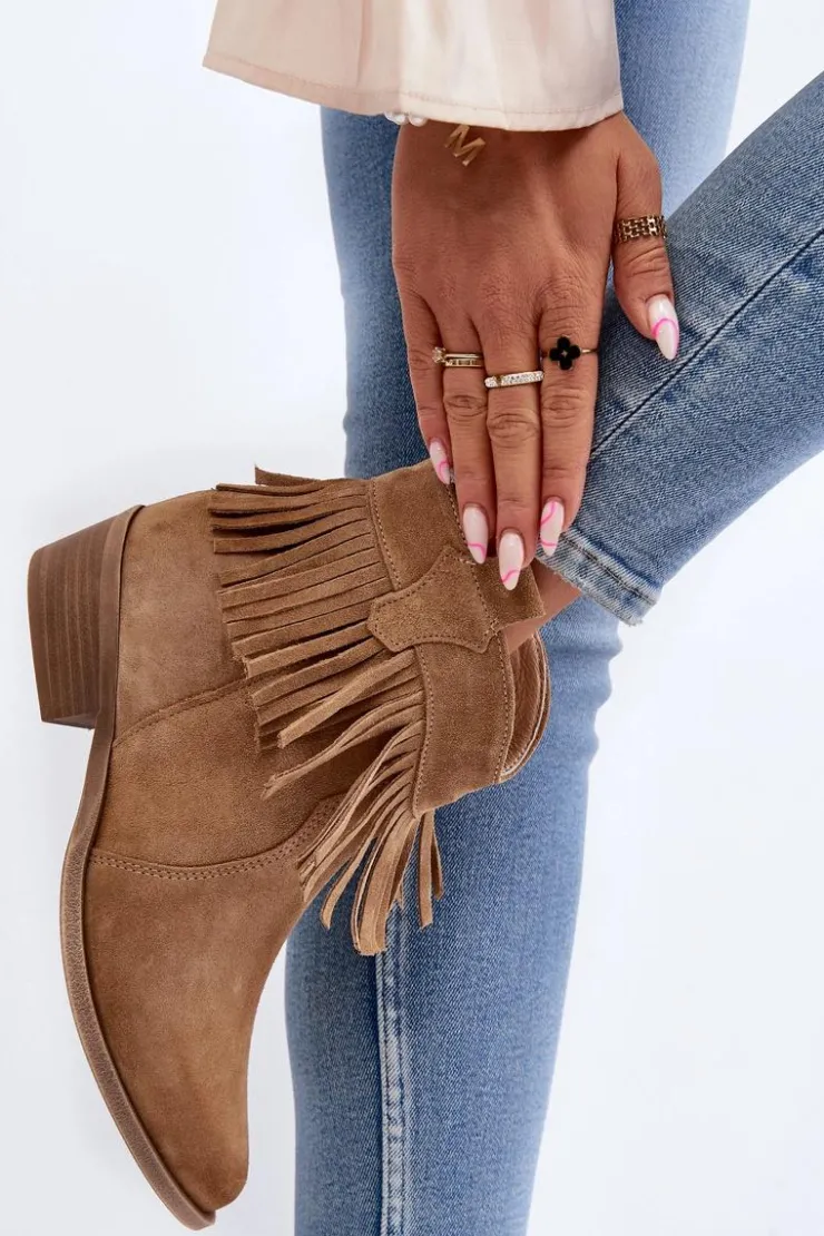 Botki damskie wykonane ze skóry naturalnej. Zapinane na suwak. Cholewka ozdobiona frędzlami. Noski w szpic optycznie wysmuklą nogi. Model ten będzie doskonałym dopełnieniem wiosennych stylizacji. Idealne do spódnic, sukienek, jak i spodni. Fason ten z pewnością przyciągnie uwagę swoim unikalnym stylem. Koniecznie powinnaś je mieć! Przy wyborze rozmiaru prosimy sugerować się tabelą rozmiarów.
