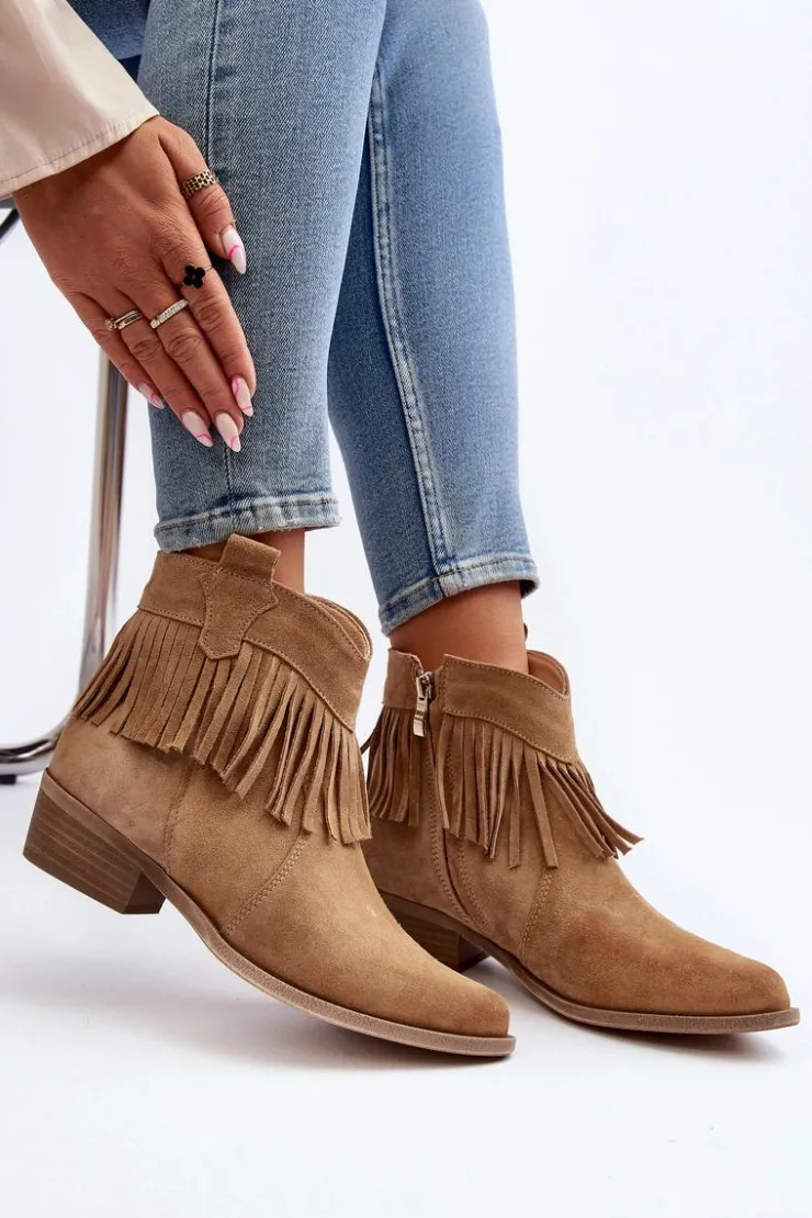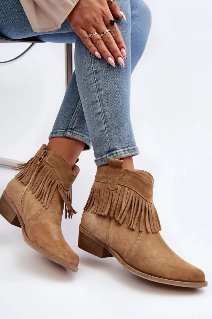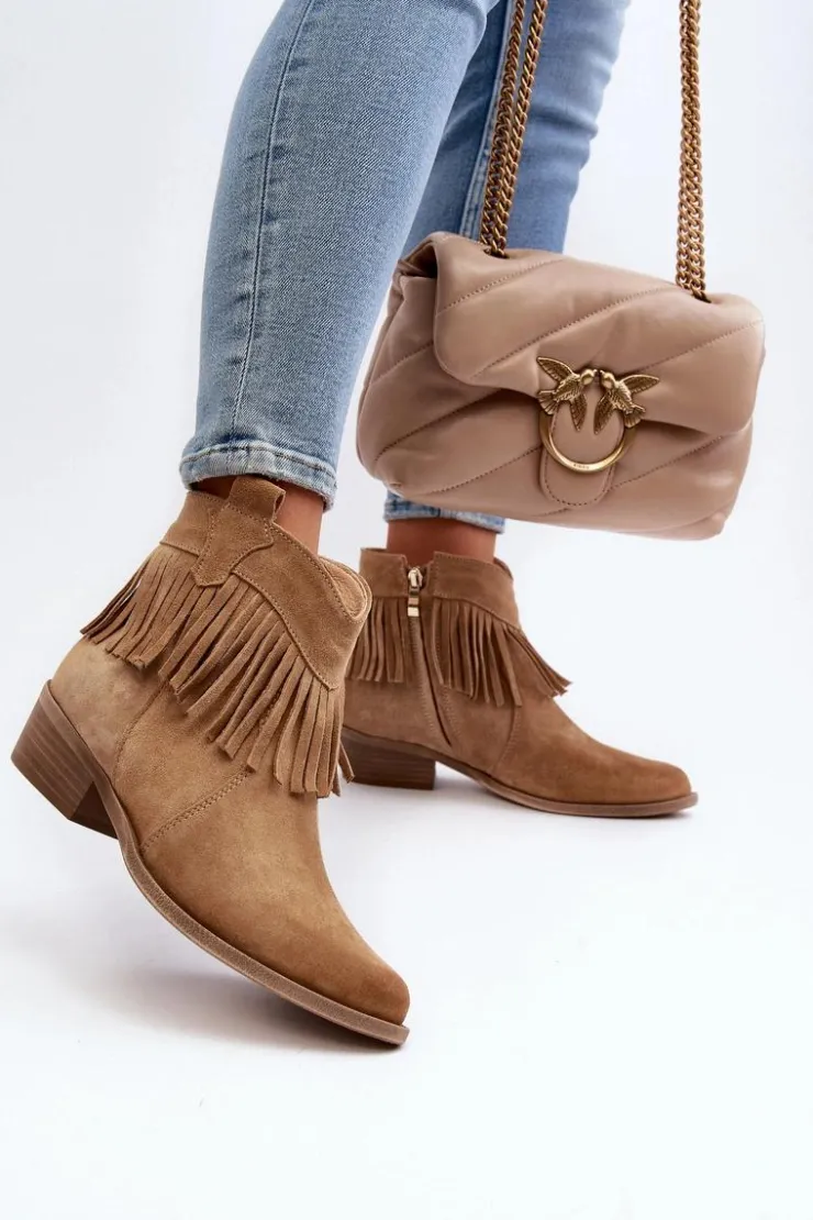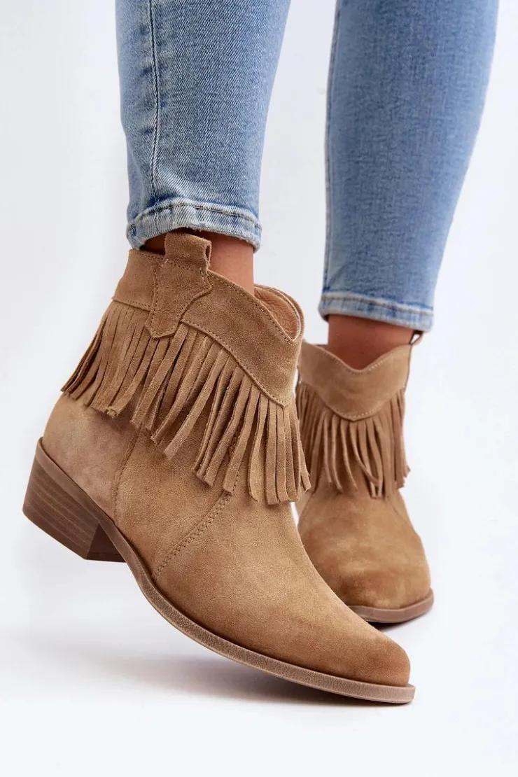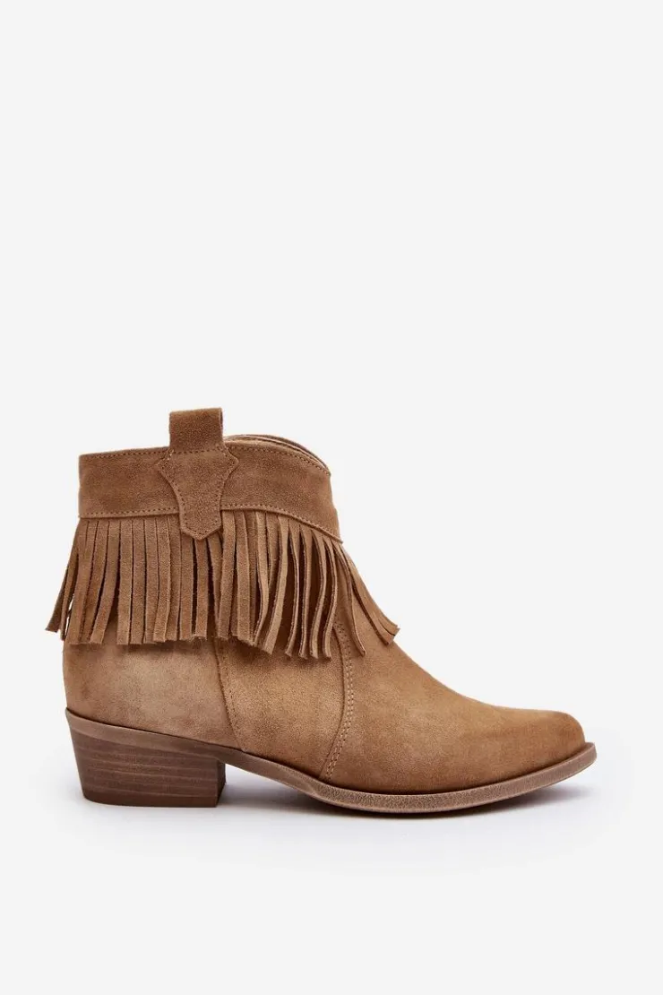 Botki damskie wykonane ze skóry naturalnej. Zapinane na suwak. Cholewka ozdobiona frędzlami. Noski w szpic optycznie wysmuklą nogi. Model ten będzie doskonałym dopełnieniem wiosennych stylizacji. Idealne do spódnic, sukienek, jak i spodni. Fason ten z pewnością przyciągnie uwagę swoim unikalnym stylem. Koniecznie powinnaś je mieć! Przy wyborze rozmiaru prosimy sugerować się tabelą rozmiarów.