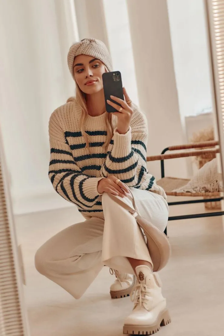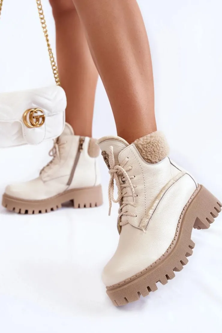 Botki w formie traperów zostały osadzone na masywnym obcasie. Podeszwa z bieżnikiem. Na języku znajduje się ozdobny element. Trapery wykonane zostały z wysokiej jakości naturalnych skór. Wewnątrz botki ocieplono wełną. Model ten posiada sznurowanie oraz suwak z boku cholewki. Dodatkowo zapiętek jest usztywniany. Przy wyborze rozmiaru prosimy sugerować się tabelą rozmiarów.