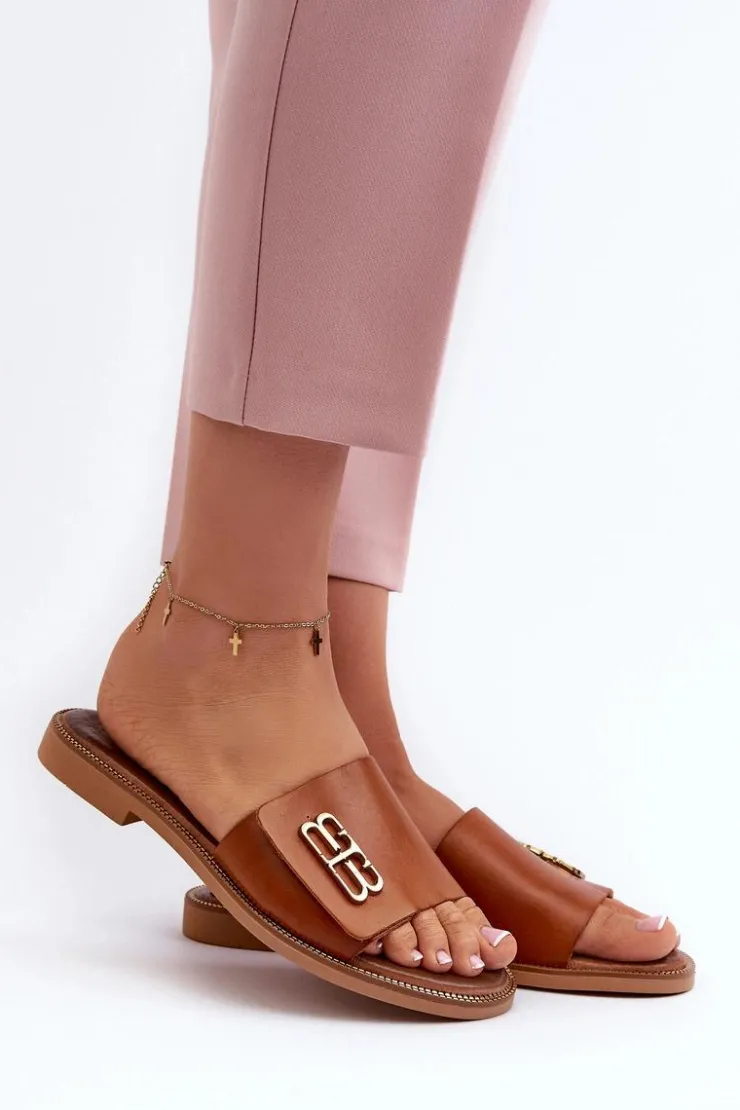 Eleganckie klapki damskie wykonane ze skóry naturalnej. Osadzone na płaskim obcasie. Z przodu złota ozdoba. Dzięki wysokiej jakości wykonania te klapki staną się nieodłącznym elementem letnich stylizacji! Przy wyborze rozmiaru prosimy sugerować się tabelą rozmiarów.