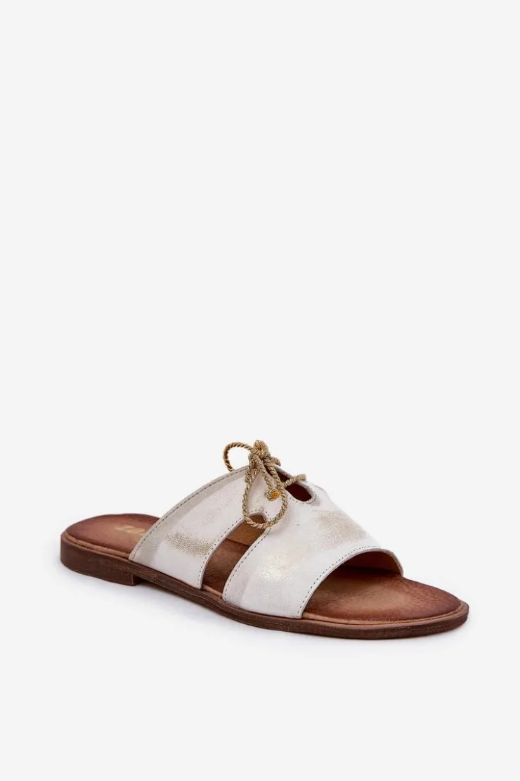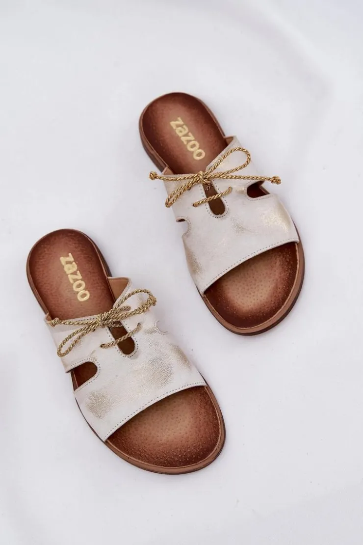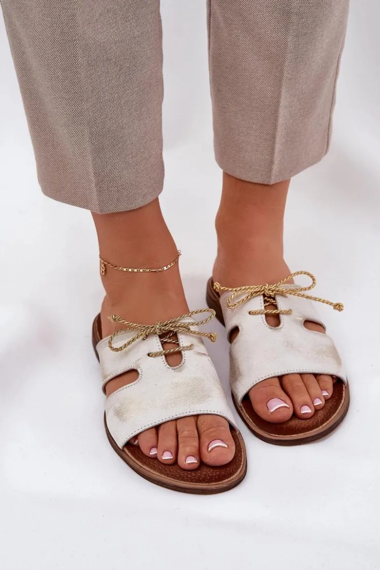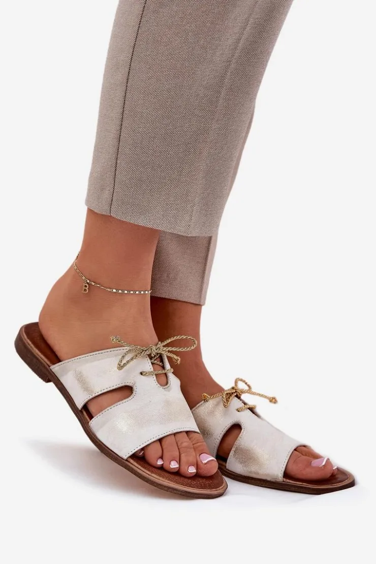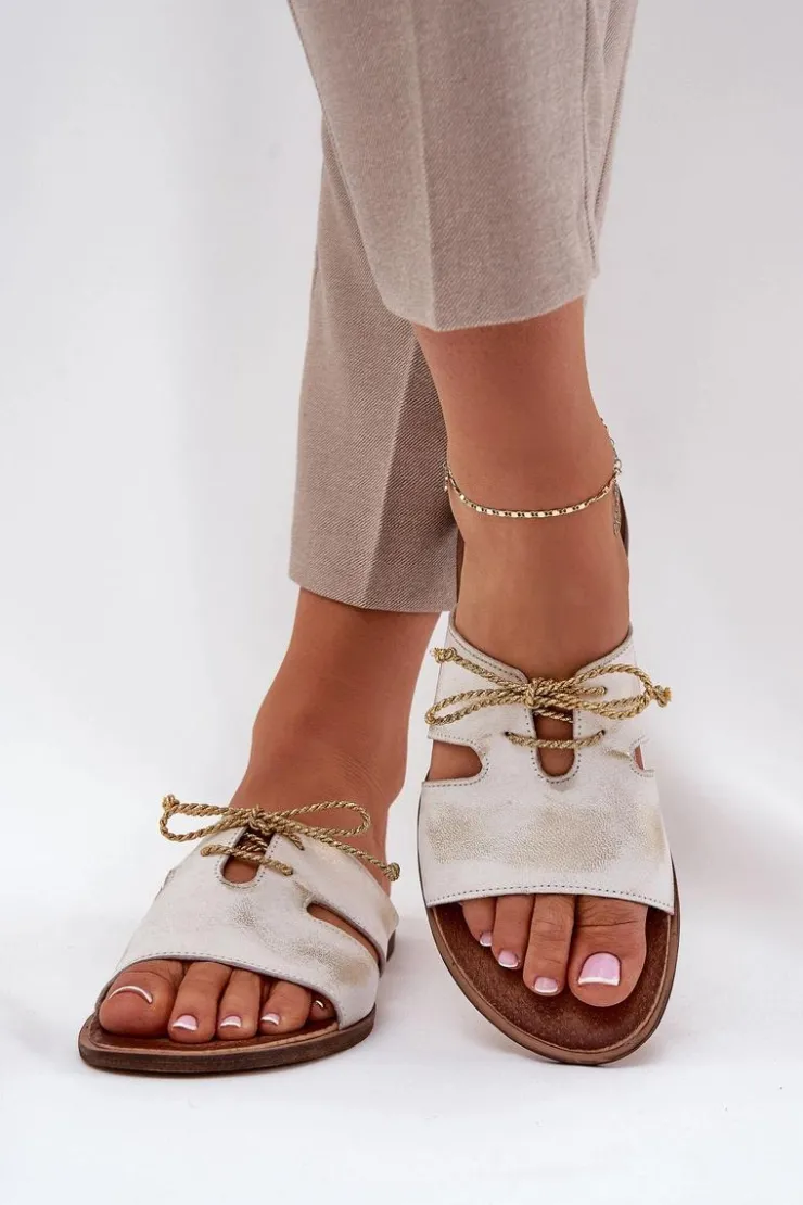 Damskie klapki z naturalnej skóry to świetny wybór na słoneczne dni, łączący elegancję z wygodą. Płaski obcas zapewnia komfort, a szykowny złoty sznureczek na cholewce dodaje im wyjątkowego uroku. Doskonałe do różnych letnich stylizacji, te klapki będą doskonałym dopełnieniem Twojego looku! Przy wyborze rozmiaru prosimy sugerować się tabelą rozmiarów.