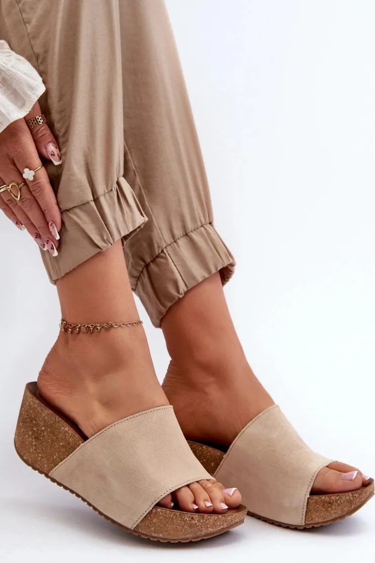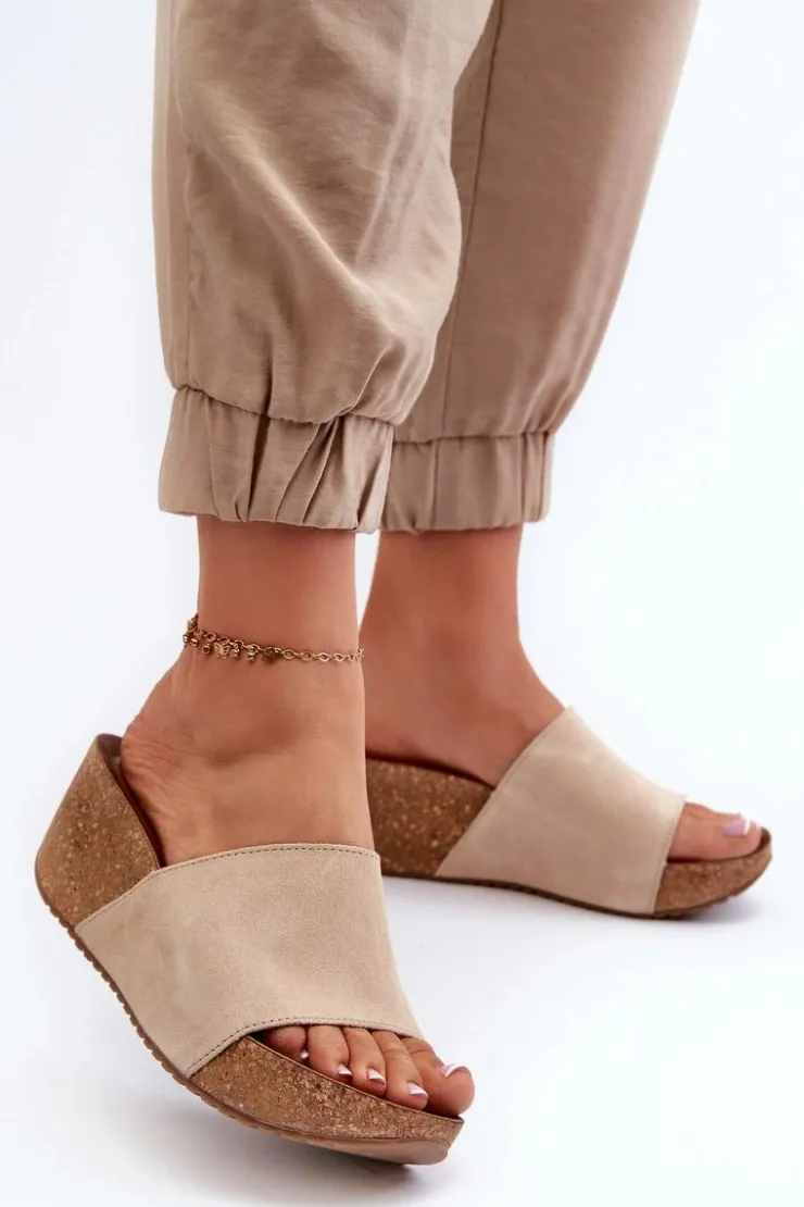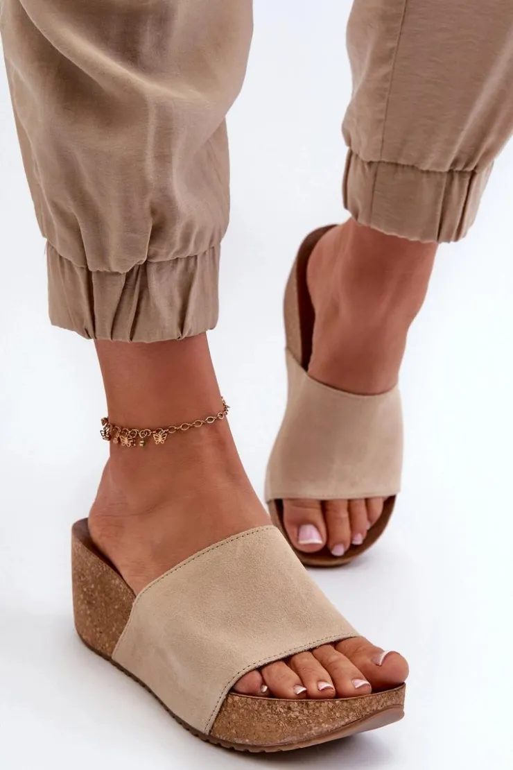 Klapki damskie na korkowym koturnie. Wykonane z wysokiej jakości naturalnego zamszu, zapewniają trwałość i komfort noszenia. Modny fason, który będzie idealnym wyborem na letnie dni. Przy wyborze rozmiaru prosimy sugerować się tabelą rozmiarów.