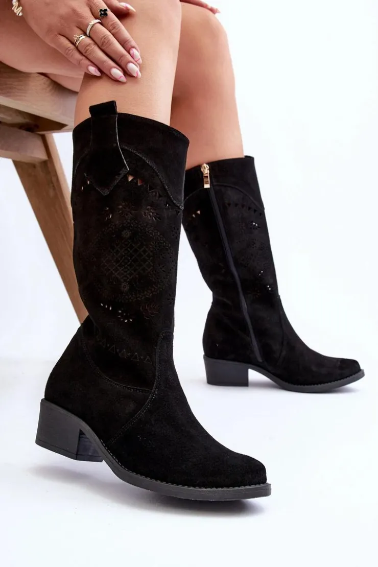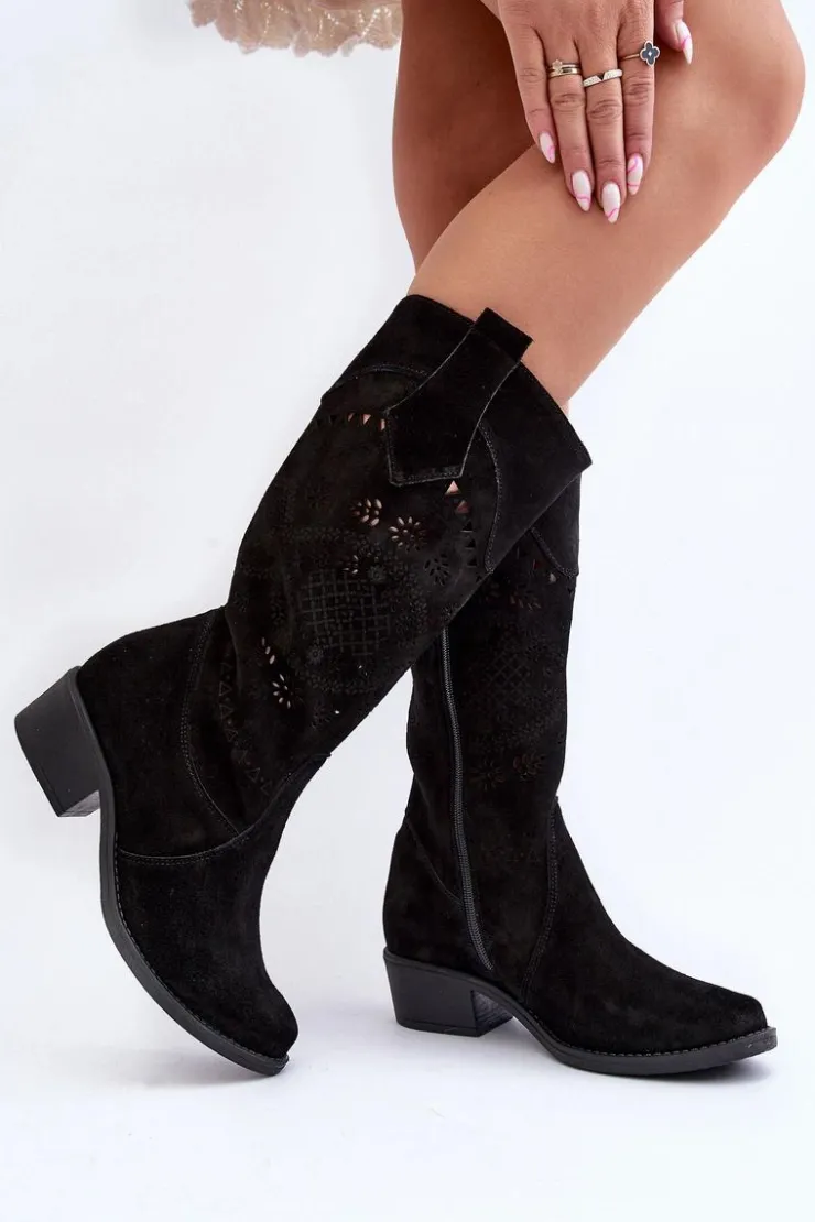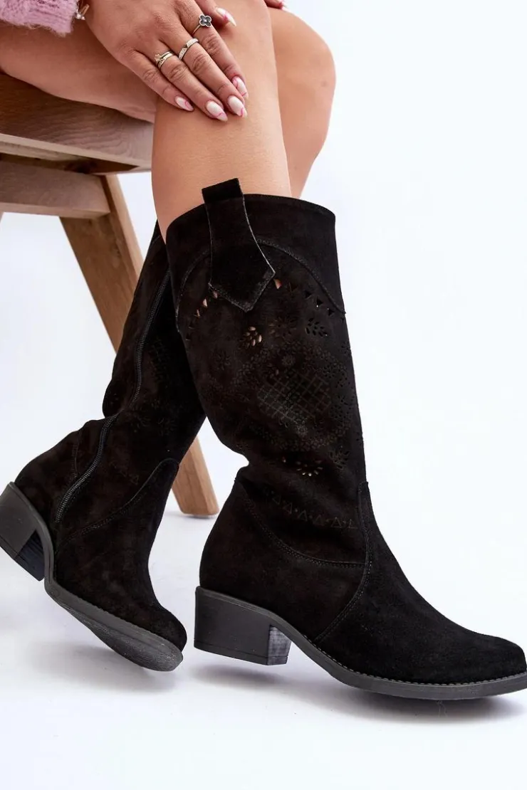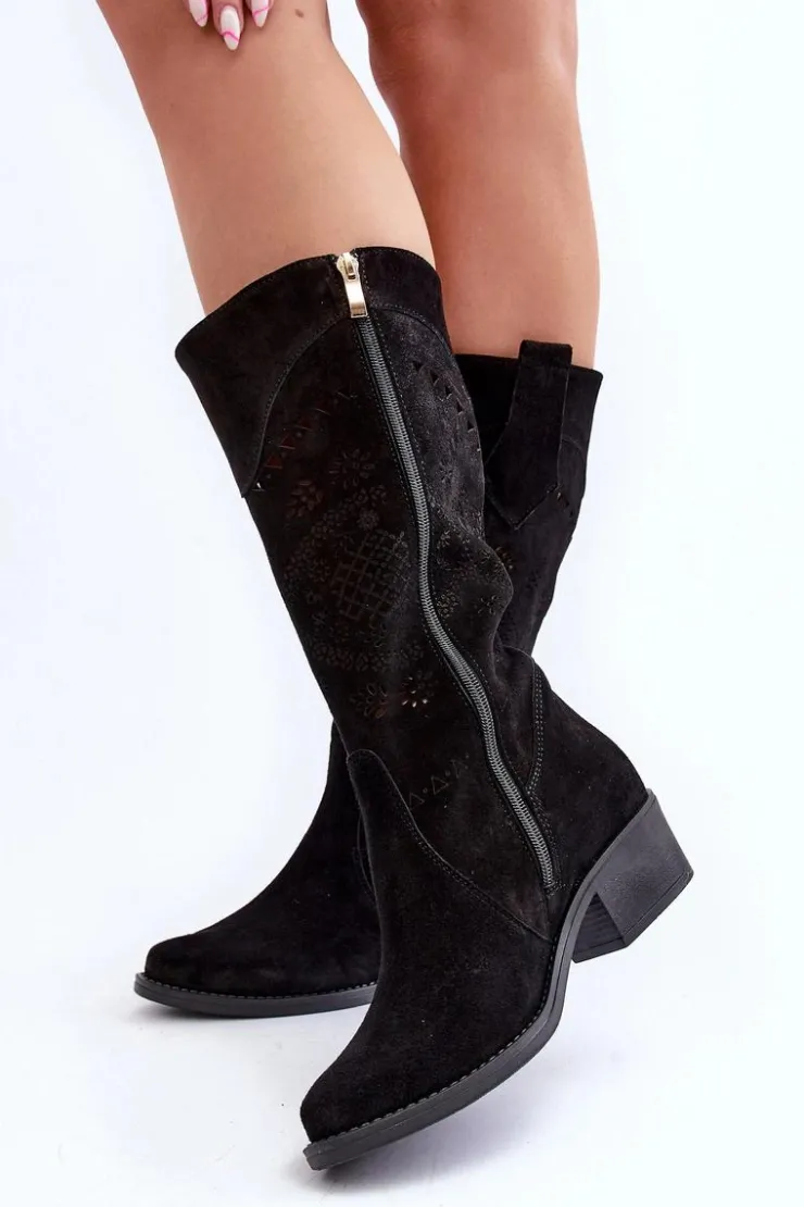 Ażurowe kozaki damskie idealnie dopełnią wiosenne stylizacje. Wykonane ze skóry naturalnej zamszowej. Osadzone na niskim obcasie. Cholewka do połowy łydki zapinana suwakiem. Noski w migdał. Miękka wkładka zapewni wygodę podczas użytkowania. Przy wyborze rozmiaru prosimy sugerować się tabelą rozmiarów.