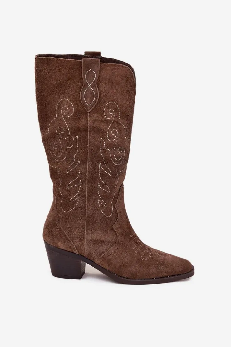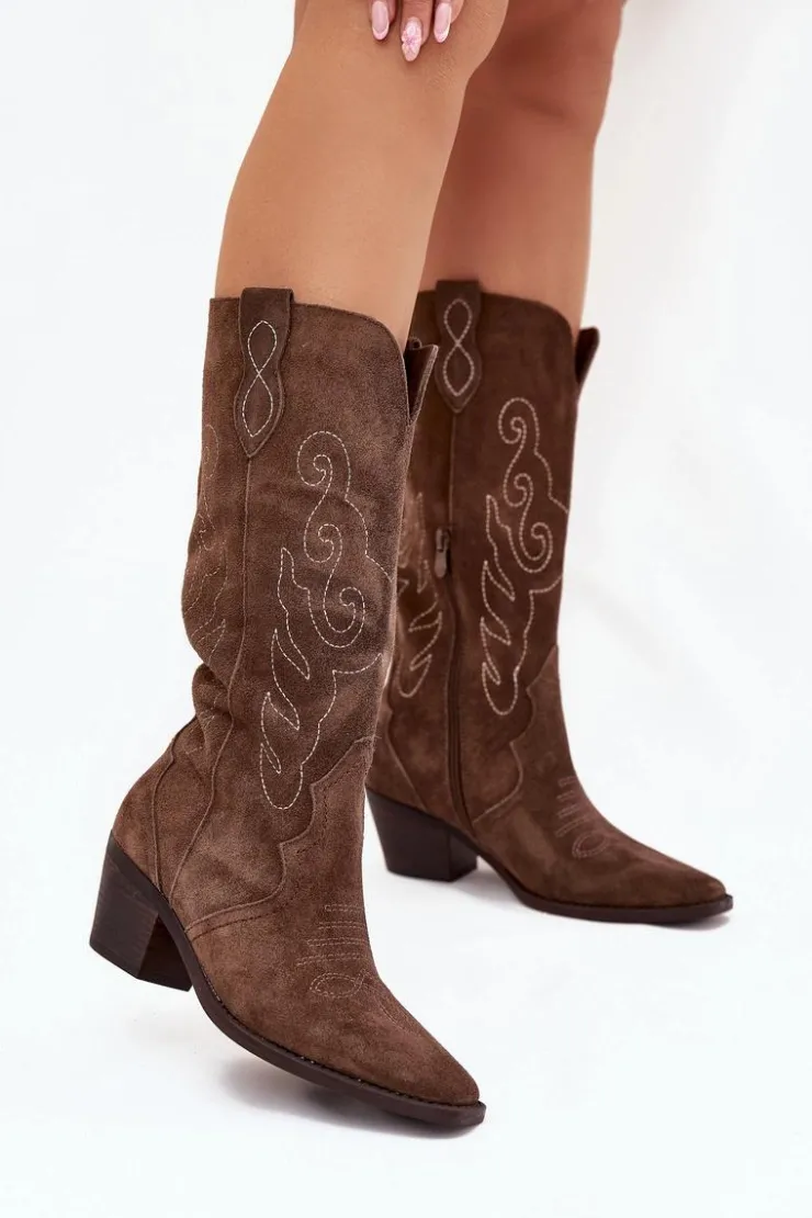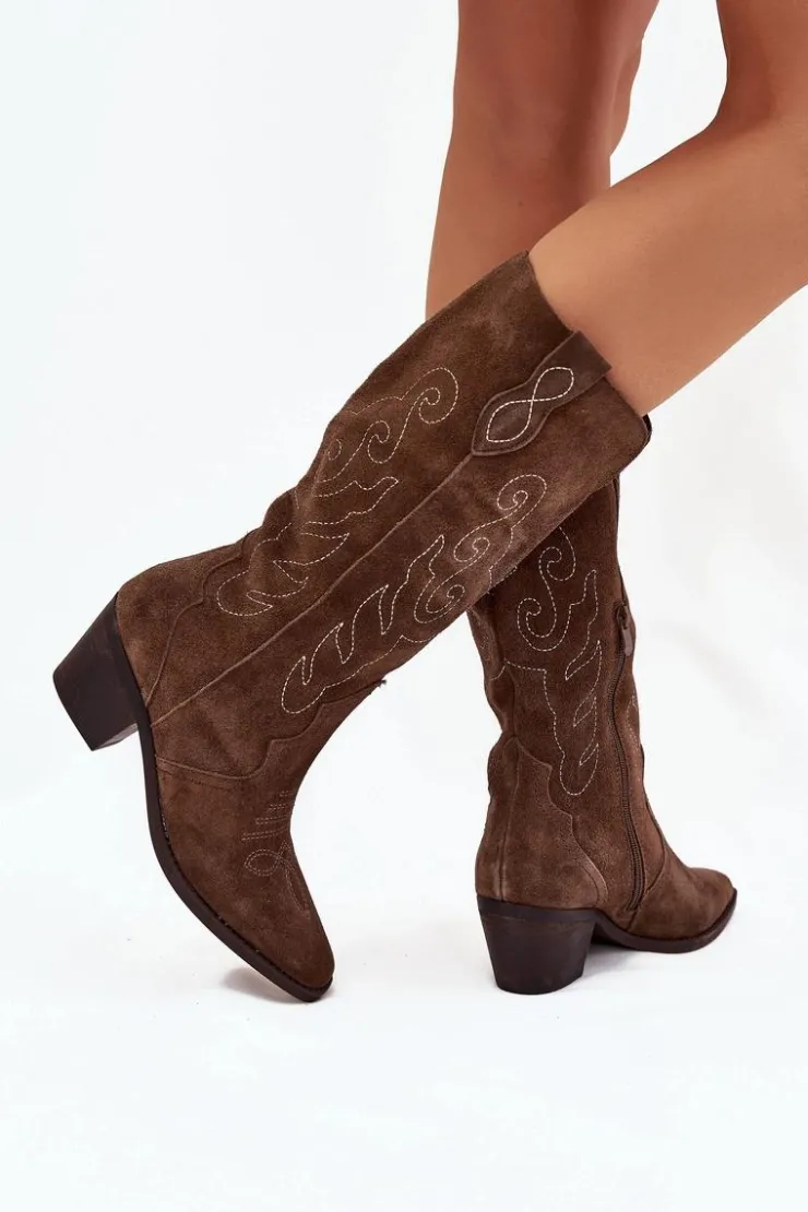 Kozaki damskie w stylu kowbojek to niezwykle modne obuwie na sezon jesienno-zimowy. Wykonane z naturalnego zamszu. Stabilny, niski obcas sprawia, że są one wygodne i idealne do noszenia na co dzień. Model wsuwany z dodatkowym zapięciem na suwak ułatwia zakładanie butów. Cholewka z przeszyciami, co dodaje im charakterystycznego, kowbojskiego stylu. Stylowy fason sprawia, że te kozaki będą doskonałym wyborem do różnych stylizacji, zarówno na co dzień, jak i na specjalne okazje. Przy wyborze rozmiaru prosimy sugerować się tabelą rozmiarów.