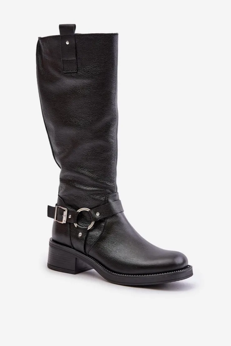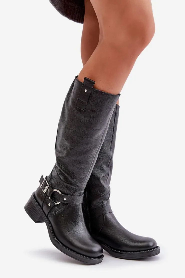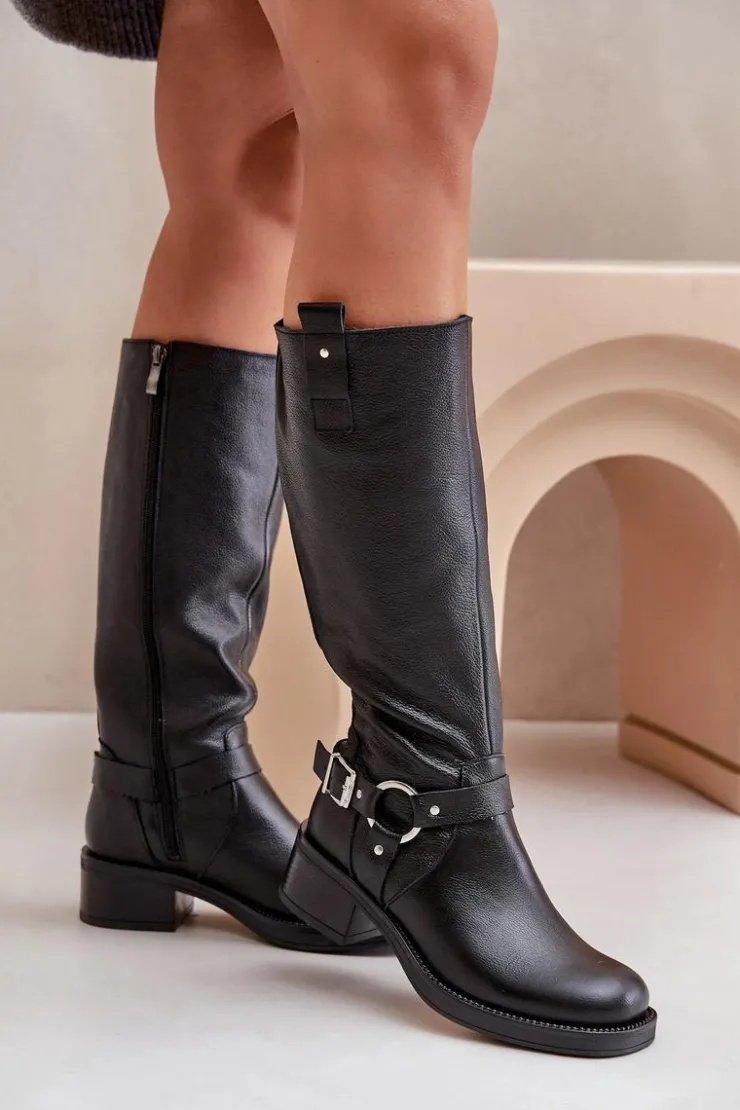 Damskie kozaki wykonane z naturalnej skóry. Cholewka, sięgająca przed kolano, dodaje elegancji i doskonale współgra z różnorodnymi stylizacjami. Subtelny wygląd zapewniają zaokrąglone noski. Model zapinany na zamek, co ułatwia zakładanie, a ozdobne paski na cholewce nadają im charakteru. Środek ocieplany filcem. Te idealne na co dzień i wyjątkowe wydarzenia kozaki będą świetnym uzupełnieniem Twojej garderoby! Przy wyborze rozmiaru prosimy sugerować się tabelą rozmiarów.
