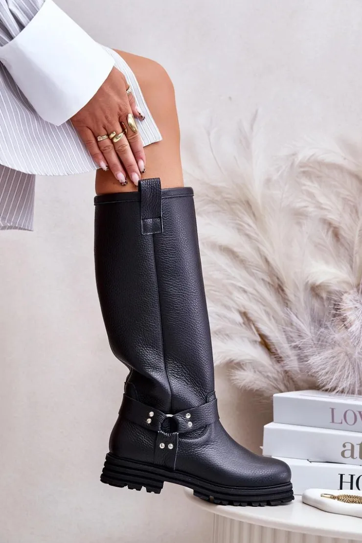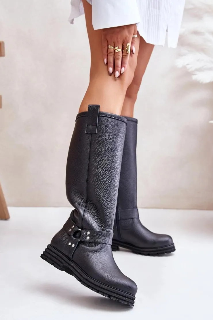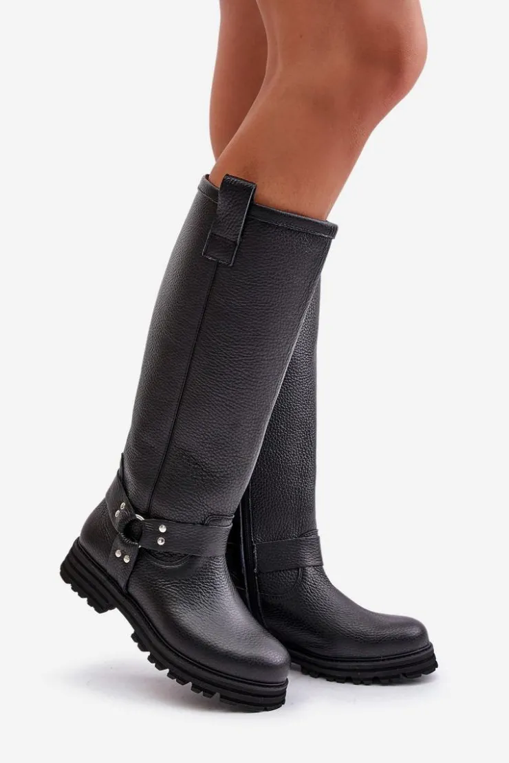 Kozaki damskie z naturalnej skóry to połączenie elegancji i wygody. Osadzone na płaskim obcasie, zapewniają komfort noszenia przez cały dzień. Cholewka sięga przed kolano, co dodaje szyku i świetnie komponuje się z różnymi stylizacjami. Zaokrąglone noski nadają im subtelnego wyglądu. Model wsuwany z praktycznym zapięciem na zamek ułatwia zakładanie, a ozdobne paski na cholewce dodają charakteru. Idealne na co dzień i wyjątkowe okazje, te kozaki będą doskonałym uzupełnieniem Twojej garderoby! Przy wyborze rozmiaru prosimy sugerować się tabelą rozmiarów.