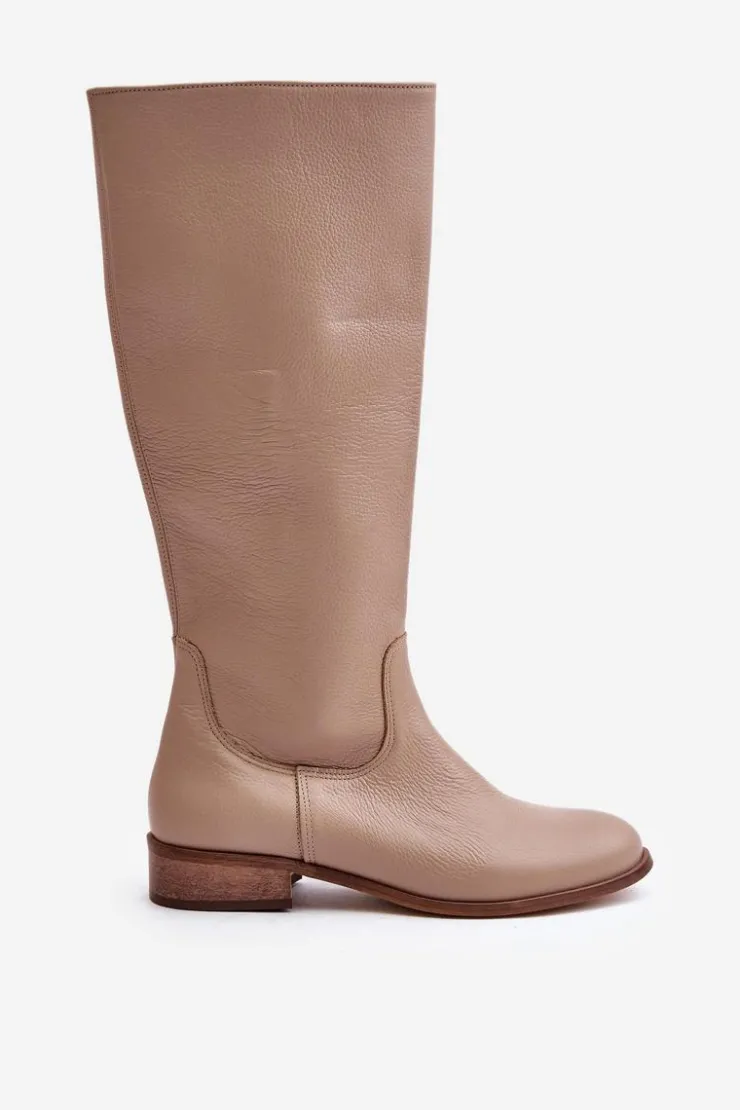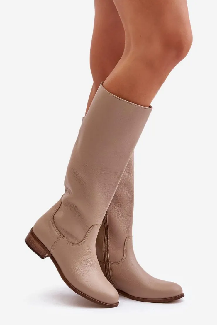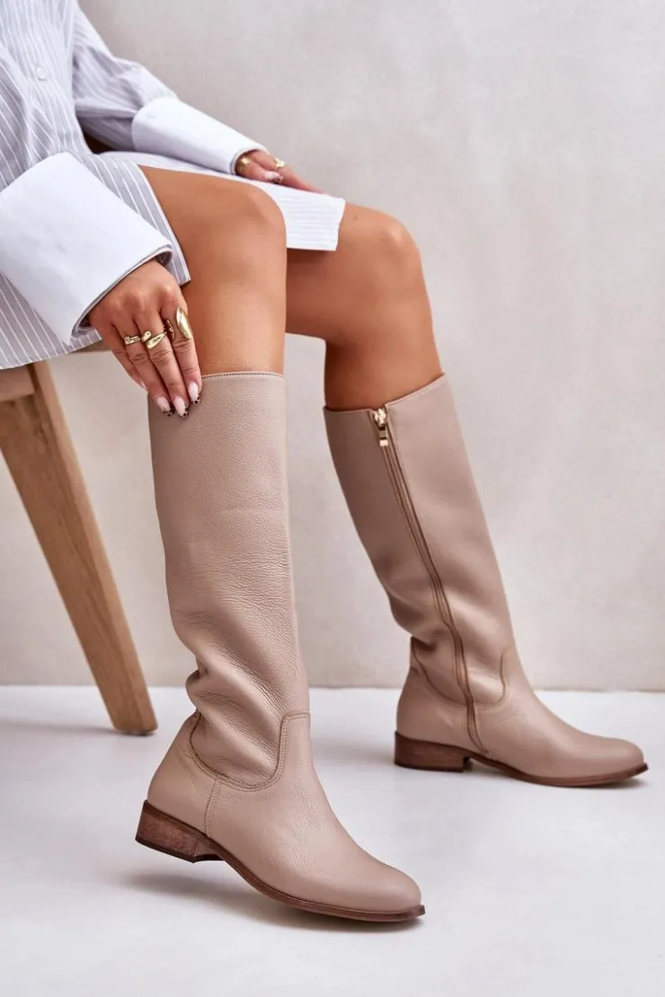 Kozaki damskie wykonane z wysokiej jakości naturalnej skóry. Zapinane na suwak znajdujący się na boku. Osadzone na płaskim obcasie. Nie posiadają ocieplenia. Noski zaokrąglone. Zapiętek jest usztywniony. Wygodny i komfortowy w użytkowaniu model. Ten klasyczny fason świetnie sprawdzi się w wielu stylizacjach! Przy wyborze rozmiaru prosimy sugerować się tabelą rozmiarów.
