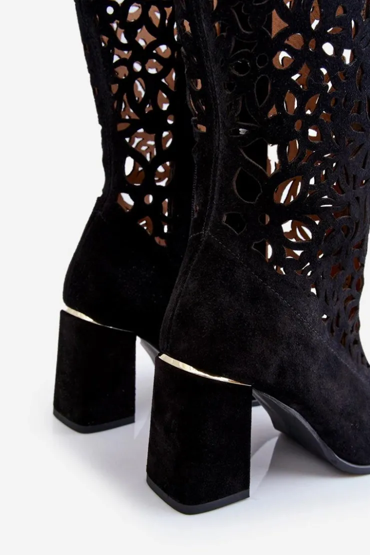 Kozaki z ażurową cholewką do kolana oraz noskiem w szpic. Zapinane na zamek błyskawiczny oraz wsuwane. Posiadają usztywniany zapiętek. Wykonane z wysokiej jakości skór naturalnych. Z tymi kozakami stworzysz wiele ciekawych stylizacji na co dzień. Miękka, skórzana wkładka oraz stabilny obcas w postaci słupka zapewnią wygodę podczas użytkowania. Przy wyborze rozmiaru prosimy sugerować się tabelą rozmiarów.