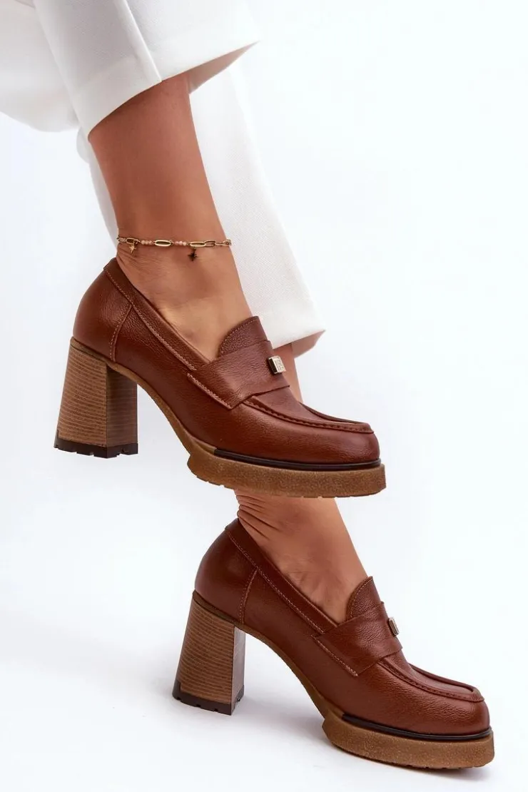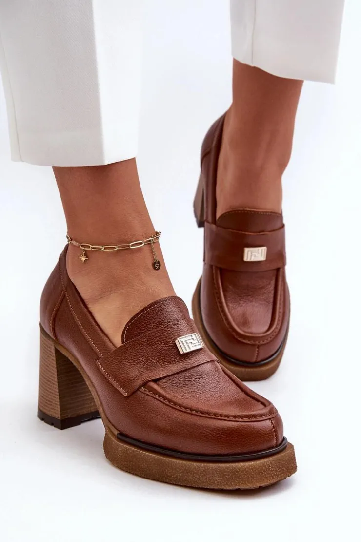 Damskie półbuty na obcasie w postaci słupka z delikatną platformą. Wykonane ze skóry naturalnej. Model ten posiada zaokrąglone noski. Podeszwa wykonana z gumowego tworzywa. Usztywniony zapiętek dodatkowo stabilizuje stopę. Na przodzie pasek z małą ozdobą. Idealne do wiosennych stylizacji! Koniecznie powinnaś je mieć! Przy wyborze rozmiaru prosimy sugerować się tabelą rozmiarów.
