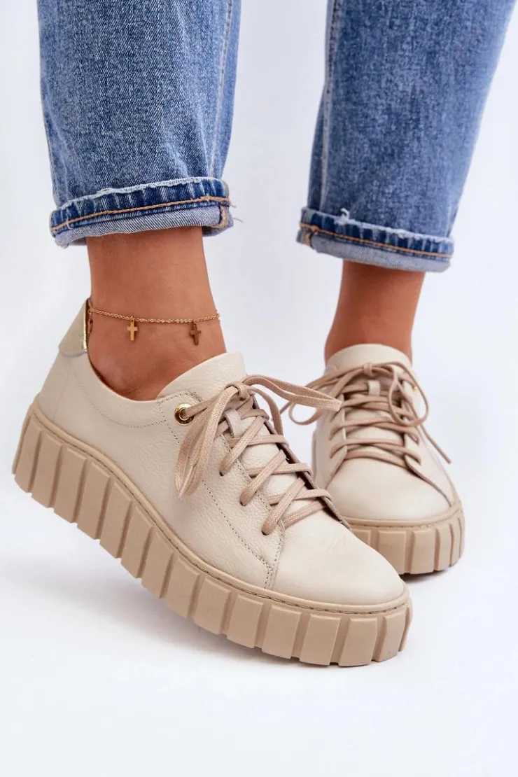 Półbuty damskie wykonane ze skóry naturalnej. Osadzone na grubej podeszwie z gumowego tworzywa. Model klasycznie sznurowany. Noski zaokrąglone. Miękka wkładka ze skóry naturalnej zapewni komfort podczas użytkowania. Idealne do wielu stylizacji. Koniecznie powinnaś je mieć! Przy wyborze rozmiaru prosimy sugerować się tabelą rozmiarów.