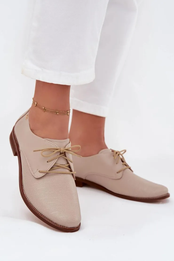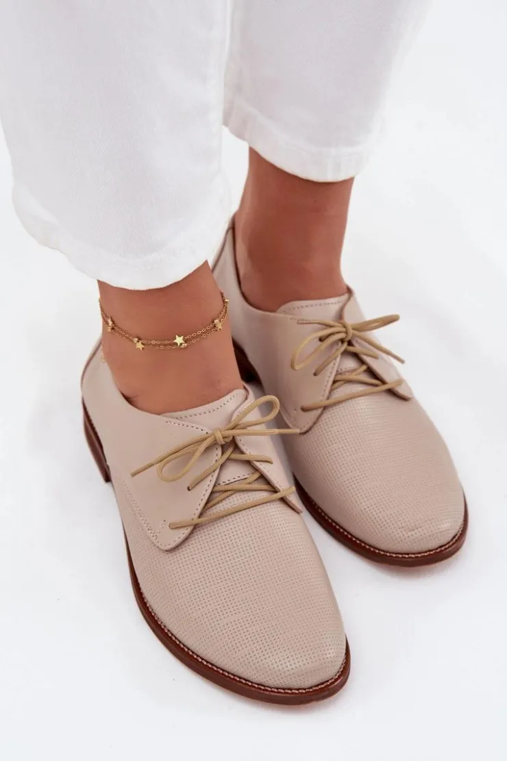 Eleganckie damskie półbuty wykonane z wysokiej jakości skóry naturalnej to połączenie klasyki z komfortem. Charakteryzują się płaskim obcasem, który zapewnia wygodę przez cały dzień. Noski zaokrąglone. Sznurowany, lekki fason pozwala na idealne dopasowanie, a elegancki wygląd sprawia, że świetnie komponują się zarówno z codziennymi, jak i bardziej formalnymi stylizacjami. Przy wyborze rozmiaru prosimy sugerować się tabelą rozmiarów.