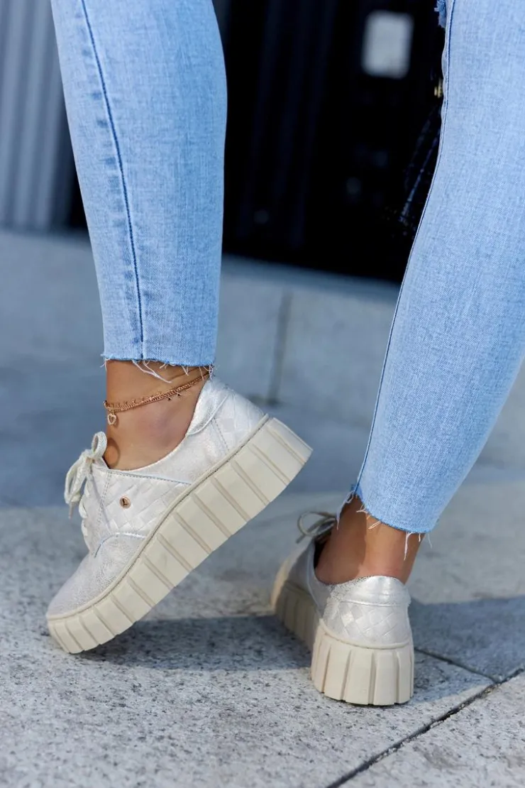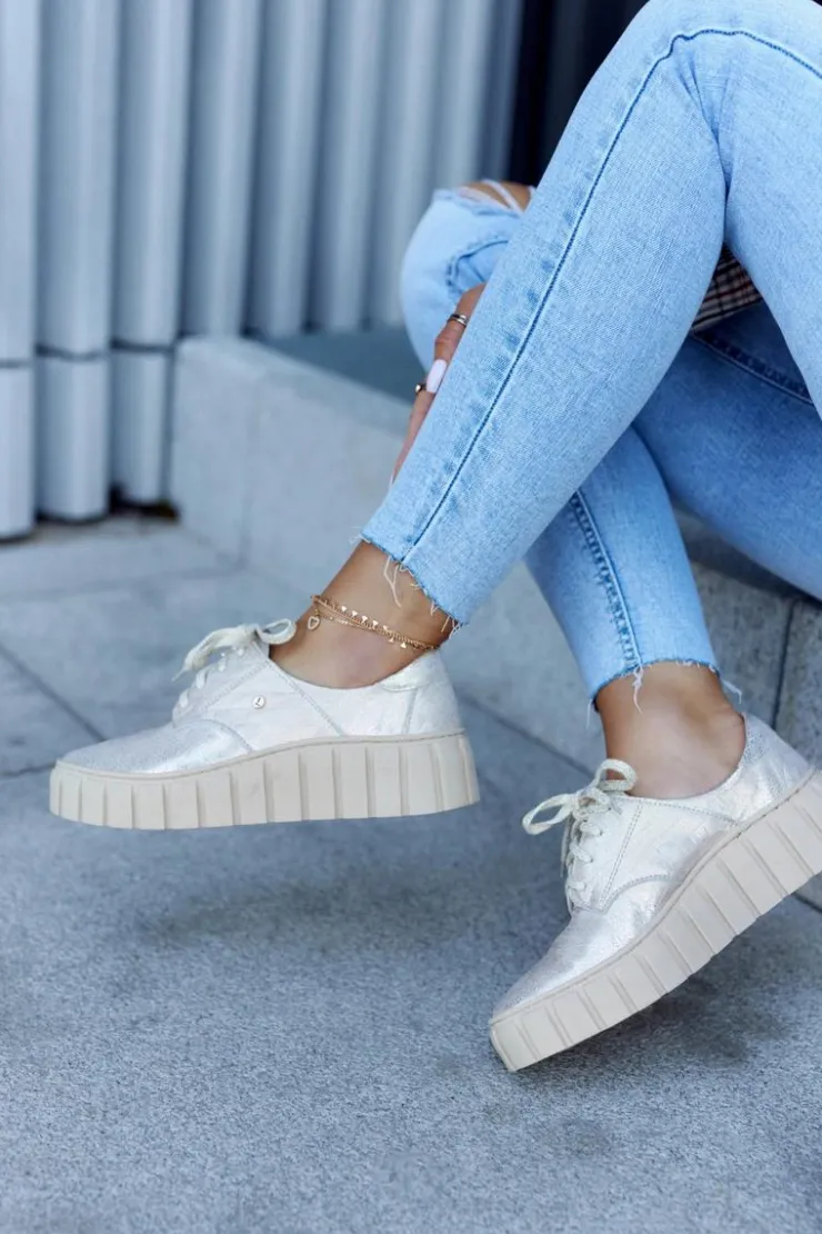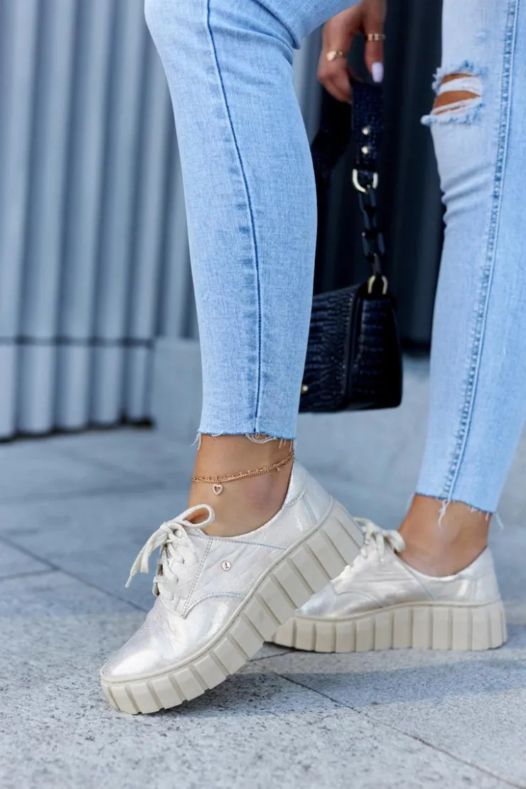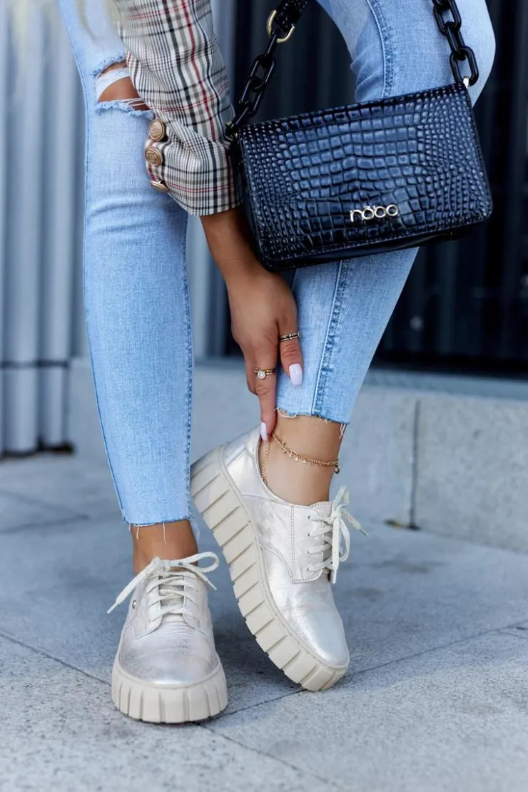 Półbuty posiadają wiązanie na płaskie, ozdobione błyszczącą nicią sznurowadła. Osadzone na masywnej platformie z żłobieniami po bokach. Wewnątrz wygodna wkładka z naturalnej skóry, która jest dodatkowo profilowana. Cholewka przed kostkę została wykonana z naturalnej skóry z efektem metalicznym. Bardzo lekkie i komfortowe w użytkowaniu. Idealne do eleganckich spodni, tiulowych spódnic czy dzianinowych sukienek. Możesz je łączyć z różnymi stylizacjami – zawsze będą wyglądać świetnie! Te cudne buty zdecydowanie muszą znaleźć się w Twojej garderobie!Przy wyborze rozmiaru prosimy sugerować się tabelą rozmiarów.