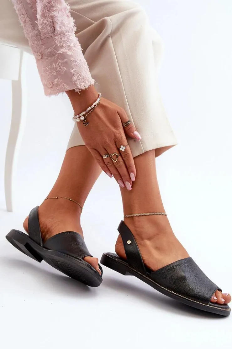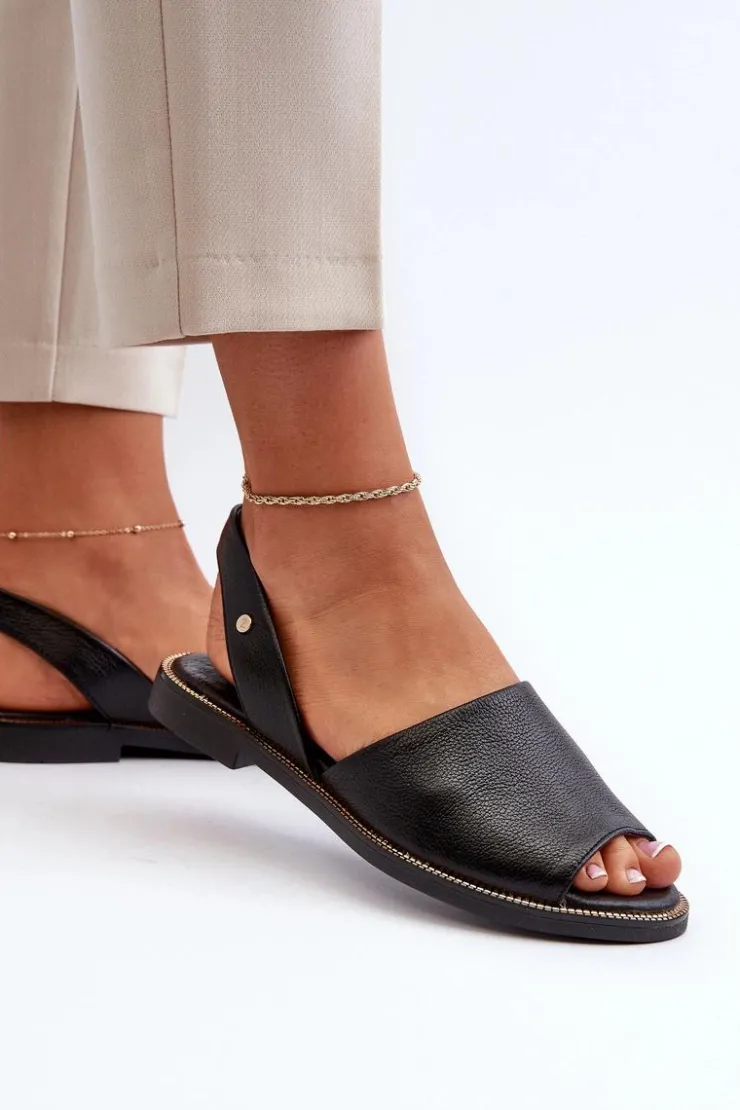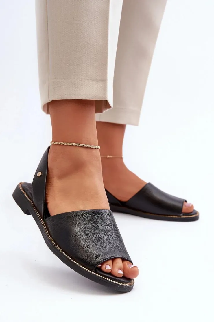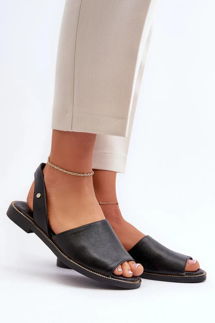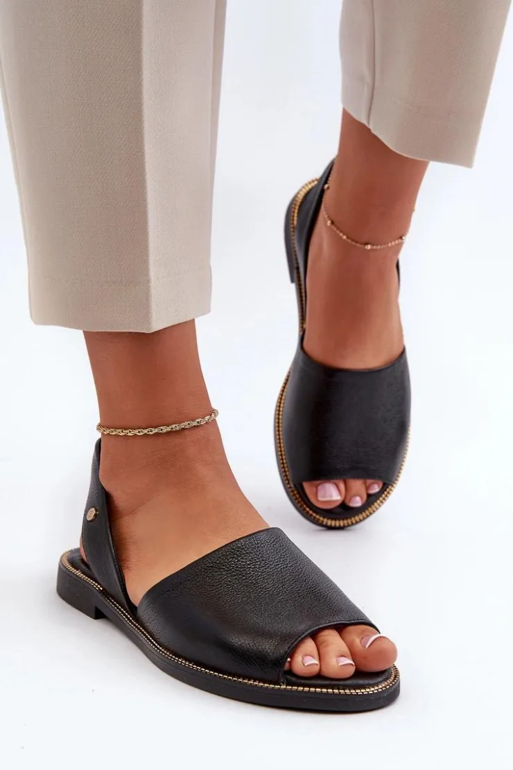Wsuwane sandałki damskie zostały wykonane z wysokiej jakości naturalnej skóry. Osadzone na płaskim obcasie ze zdobieniami przy podeszwie. Sandałki posiadają odkrytą piętę i palce. Miękka, skórzana wkładka zapewni wygodne użytkowanie. Sandałki są wsuwane, a ich tylna część cholewki jest delikatnie usztywniona. Przy wyborze rozmiaru prosimy kierować się tabelą rozmiarów.