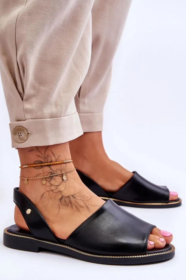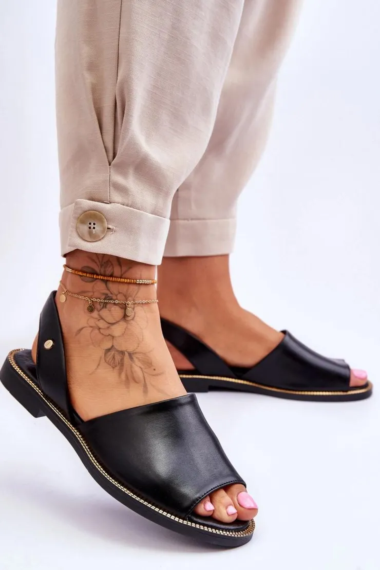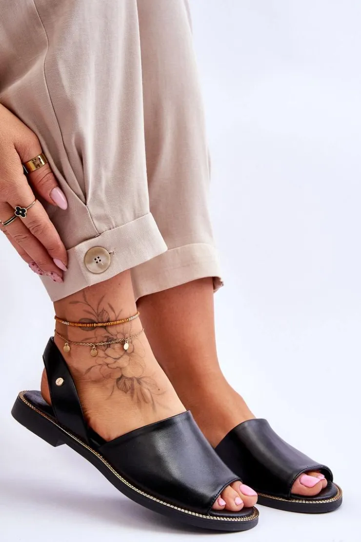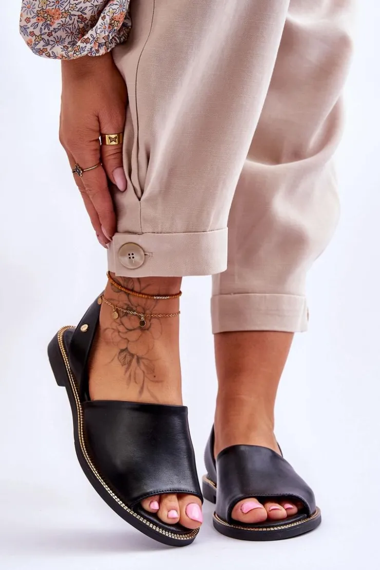 Wsuwane sandałki damskie zostały wykonane z wysokiej jakości naturalnej skóry. Osadzone na płaskim obcasie ze zdobieniami przy podeszwie. Sandałki posiadają odkrytą piętę i palce. Miękka, skórzana wkładka zapewni wygodne użytkowanie. Sandałki są wsuwane, a ich tylna część cholewki jest delikatnie usztywniona. Przy wyborze rozmiaru prosimy kierować się tabelą rozmiarów.