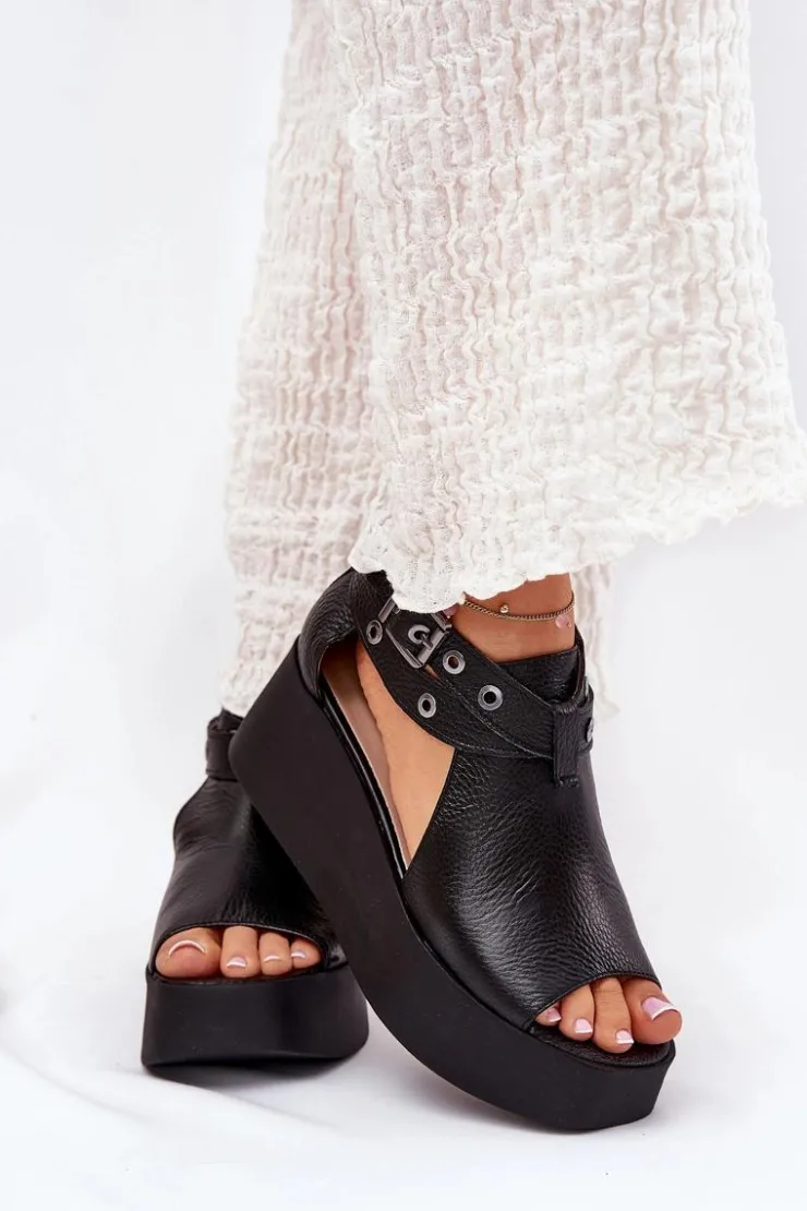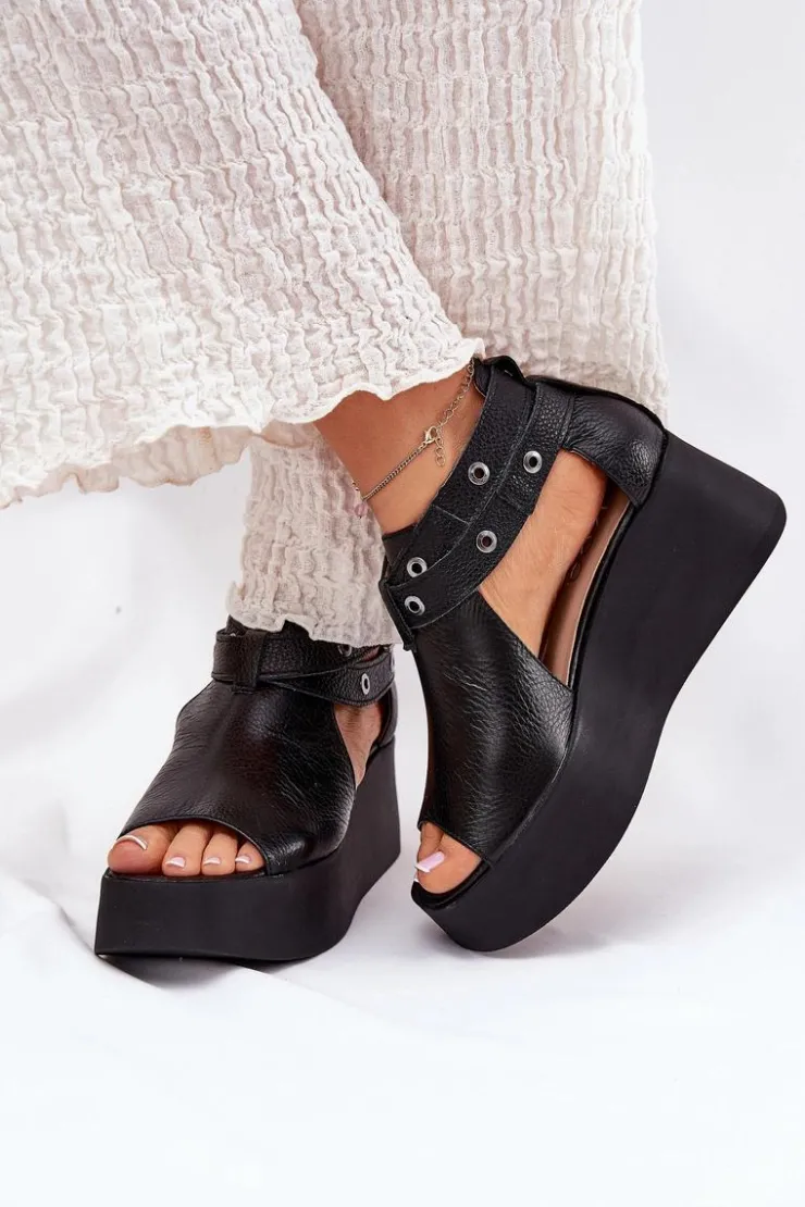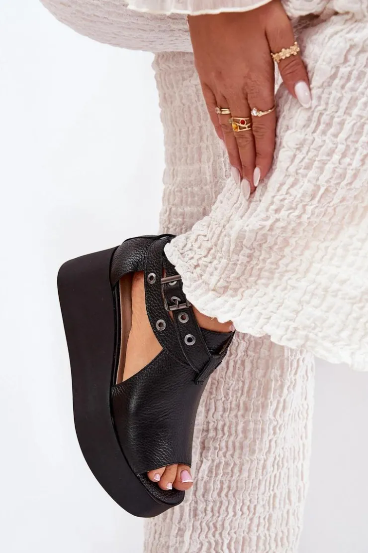 Sandały wykonane ze skóry naturalnej, są nie tylko stylowe, ale także trwałe i wygodne. Unikalny design dodaje uroku każdej letniej stylizacji, podkreślając indywidualny styl. Koturn wraz z platformą zapewniają dodatkową wysokość. Idealne dla kobiet, które cenią sobie modę i komfort w jednym! Przy wyborze rozmiaru prosimy kierować się tabelą rozmiarów.