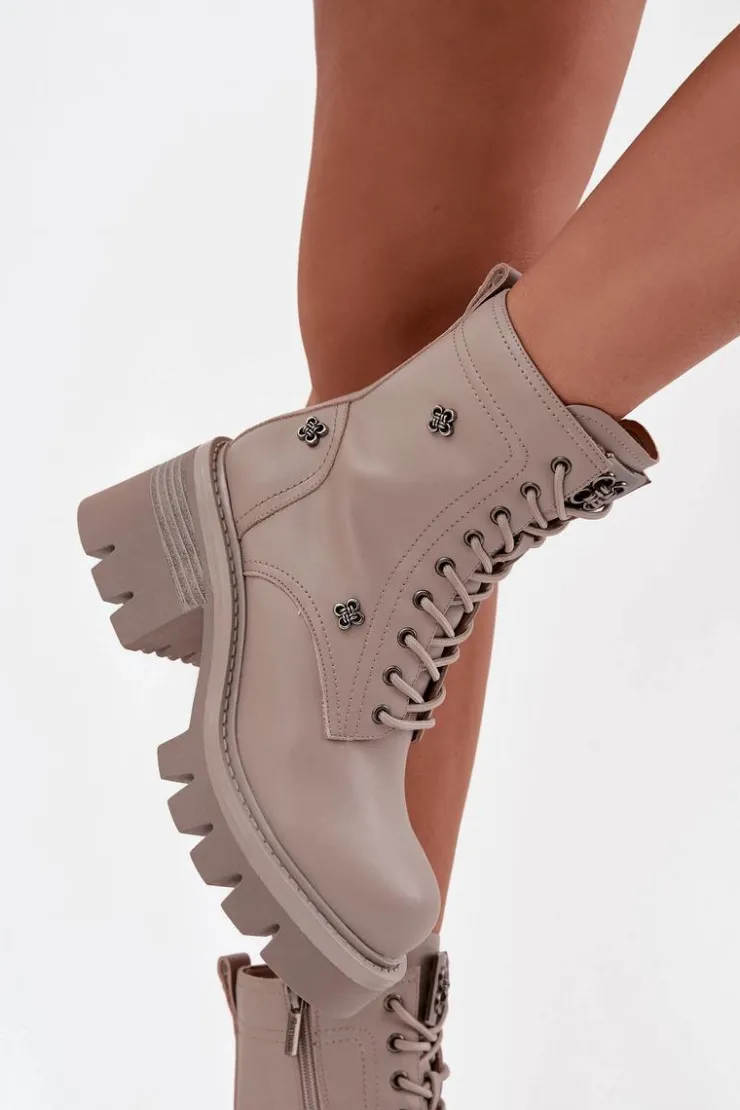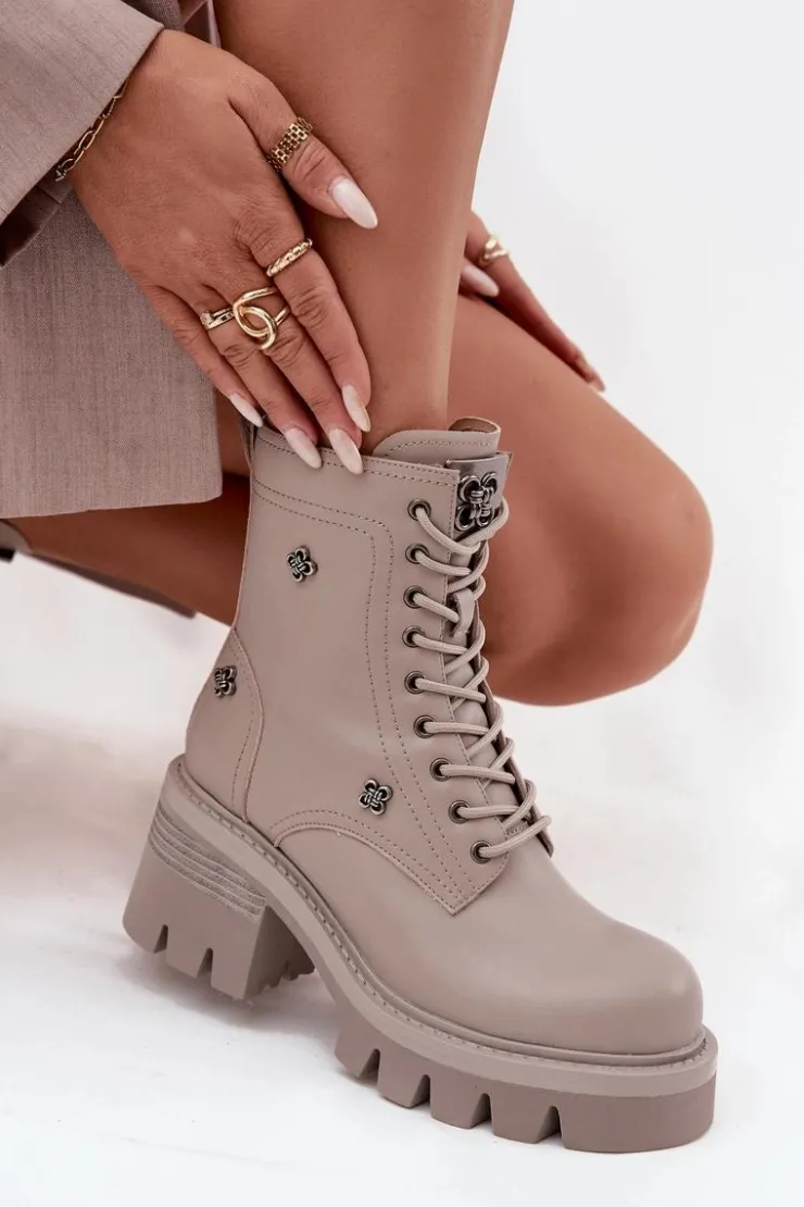 Botki damskie od marki Artiker. Wykonane z naturalnej skóry, prezentują się stylowo i są wyjątkowo trwałe. Model osadzony został na masywnym obcasie typu klocek oraz platformie, co zapewnia stabilność i wygodę podczas noszenia, jednocześnie dodając całości modnego charakteru. Buty są sznurowane i zapinane na zamek, dzięki czemu łatwo je dopasować do stopy i wygodnie zakładać. Na cholewce umieszczono ozdobne, drobne przypinki, które podkreślają unikalny styl modelu. Wnętrze zostało ocieplone, co sprawia, że botki świetnie sprawdzą się w chłodniejsze dni. To idealna propozycja dla kobiet, które cenią połączenie elegancji, komfortu i oryginalnego, miejskiego stylu. Przy wyborze rozmiaru prosimy sugerować się tabelą rozmiarów.