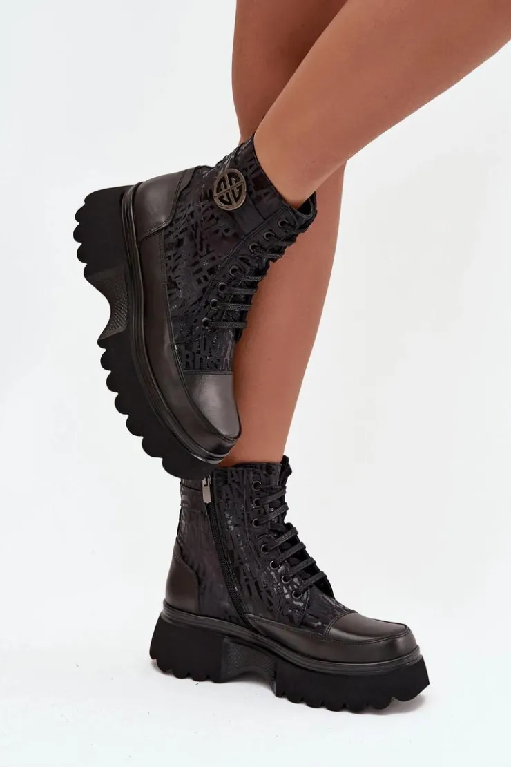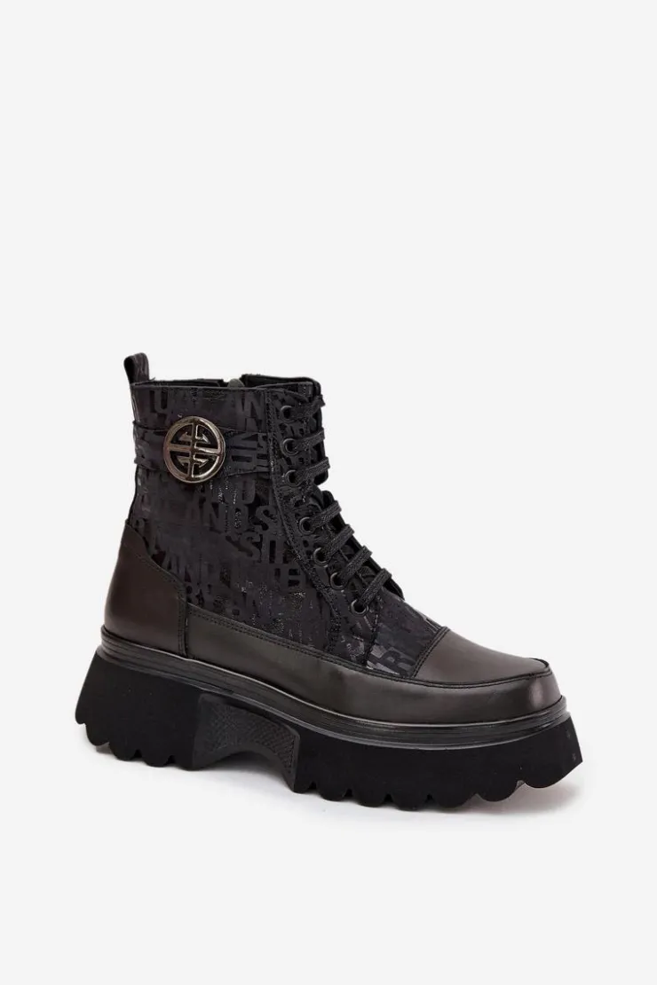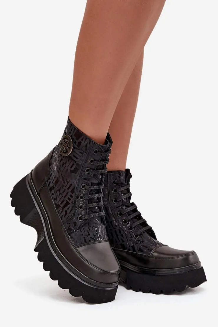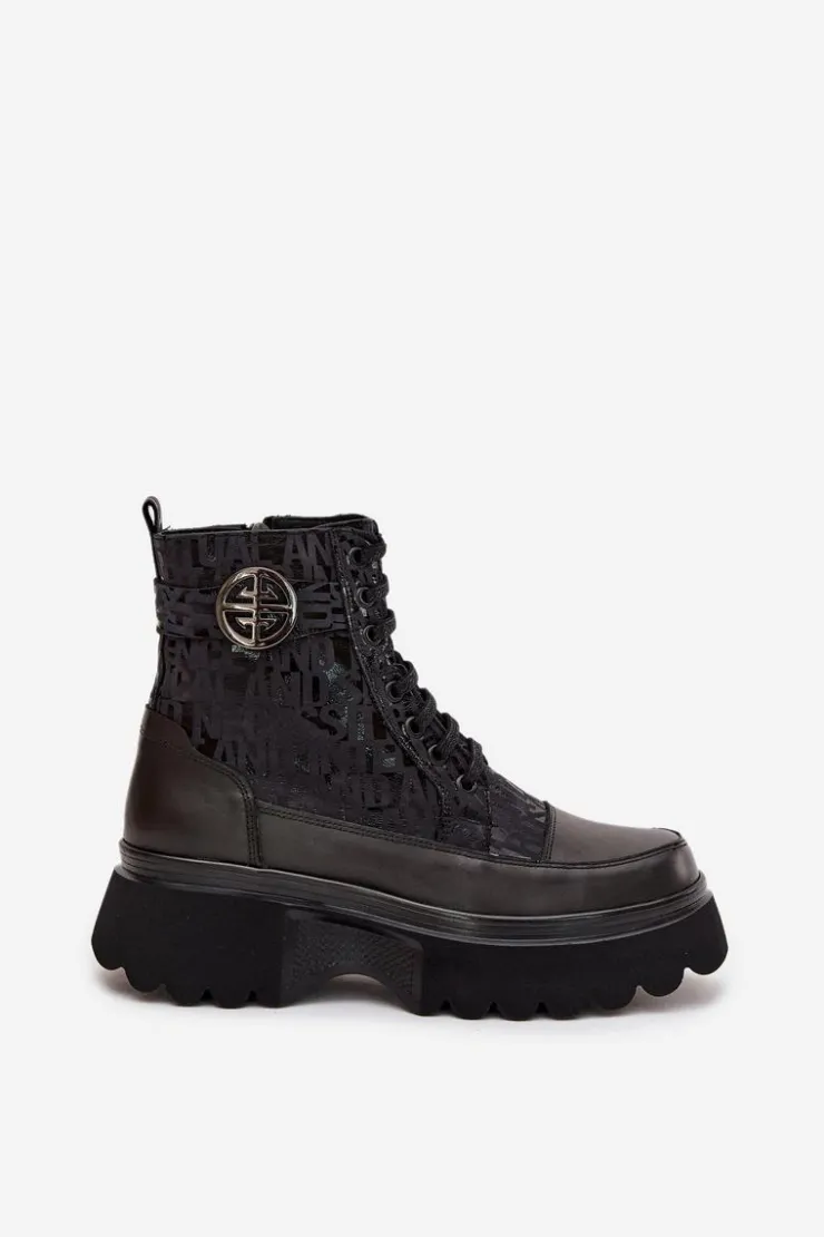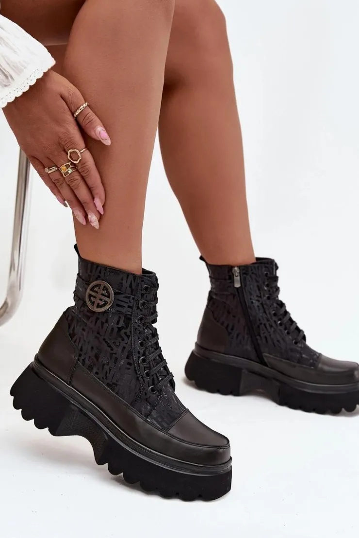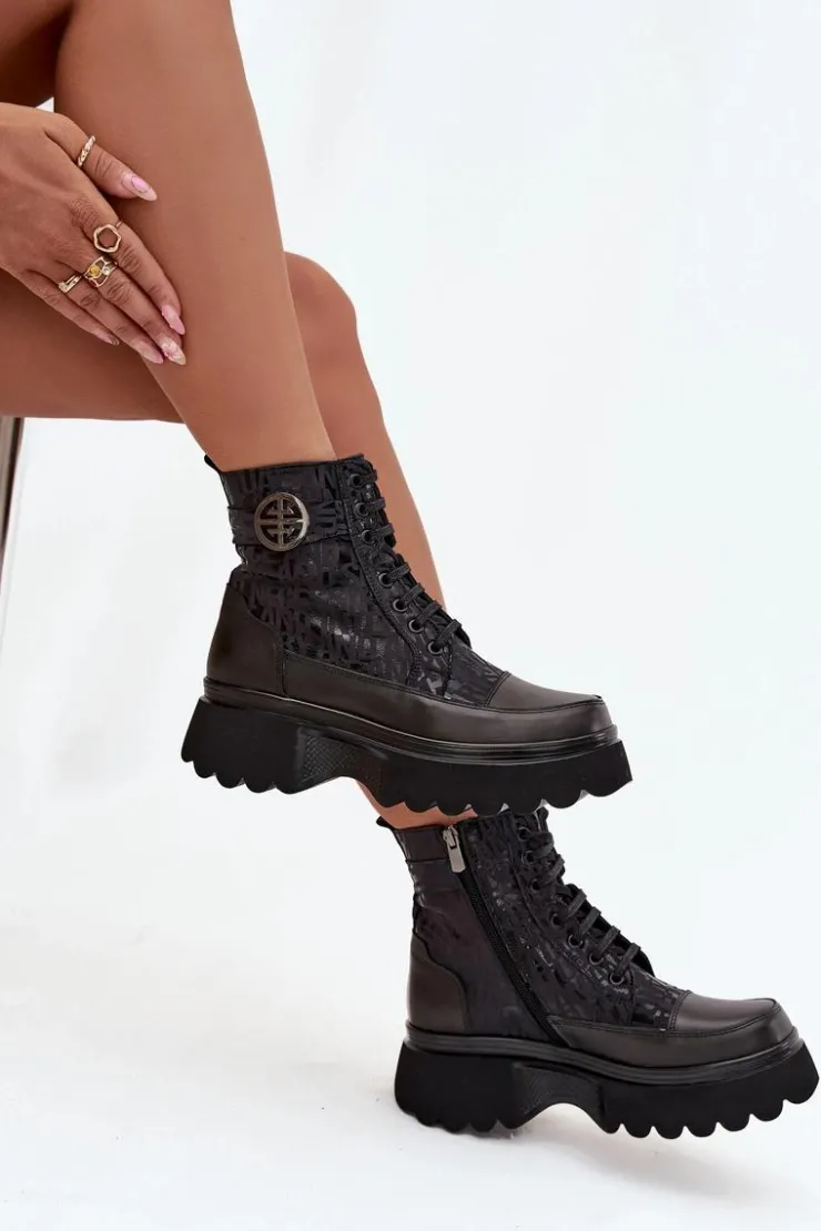 Botki damskie marki Artiker to stylowe obuwie stworzone z myślą o chłodniejszych dniach. Wykonane z naturalnej skóry, wyróżniają się solidnością i modnym wyglądem. Osadzone na stabilnej platformie, zapewniają komfort noszenia i nowoczesny wygląd. Model posiada zarówno sznurowanie, jak i praktyczny zamek, co ułatwia zakładanie oraz dopasowanie do stopy. Cholewkę zdobią modne napisy oraz pasek z ozdobnym detalem. Wnętrze ocieplone sprawia, że świetnie sprawdzą się w sezonie jesienno-zimowym. Przy wyborze rozmiaru prosimy sugerować się tabelą rozmiarów.
