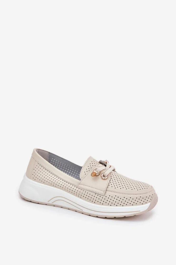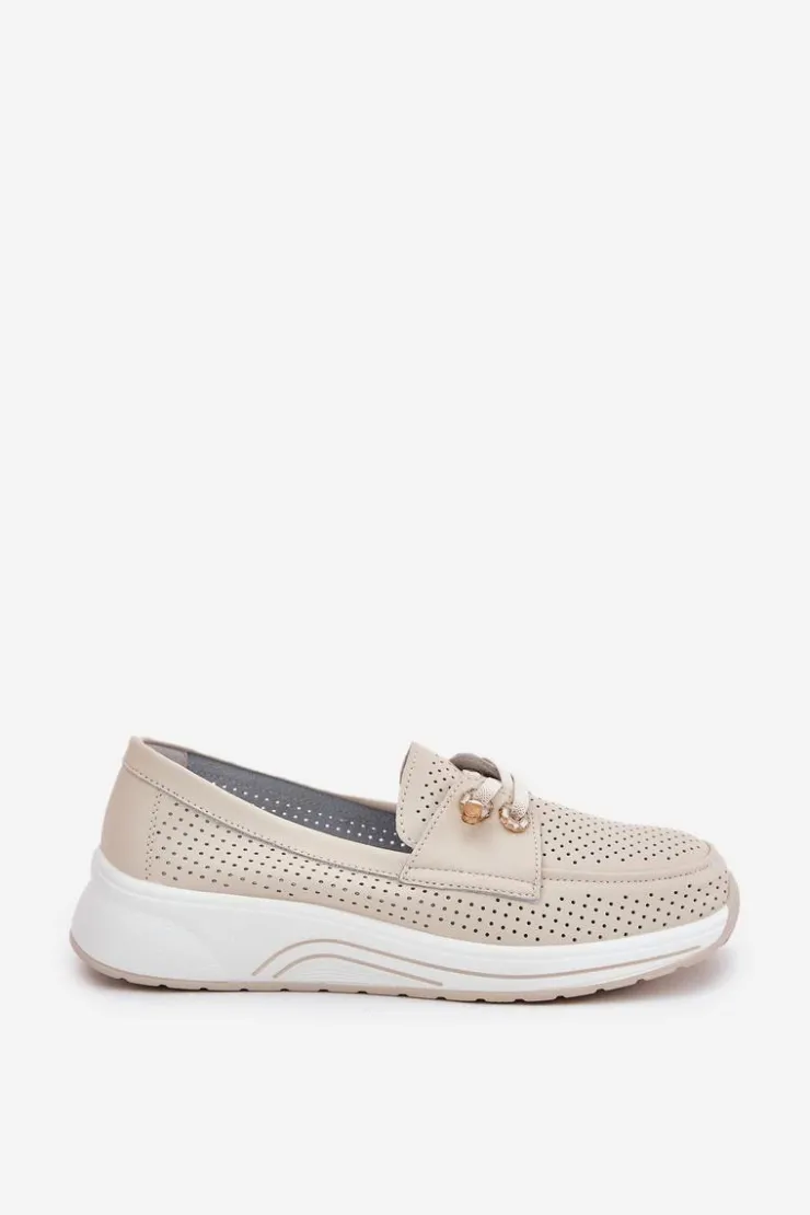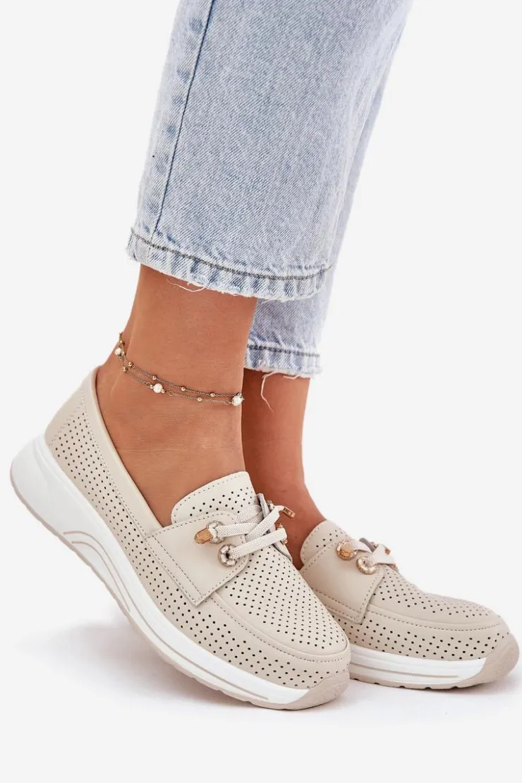Półbuty damskie wykonane z naturalnej skóry to połączenie elegancji i wygody. Osadzone na platformie, zapewniają stabilność i komfort przez cały dzień. Model posiada gumki imitujące sznurówki z ozdobnymi przypinkami, które nadają oryginalnego charakteru. Zaokrąglone noski zapewniają wygodę, a miękka wkładka dodatkowo dba o komfort stóp. Lekkie i wygodne, te półbuty będą doskonałym wyborem do codziennych stylizacji, łącząc funkcjonalność z modnym wyglądem. Przy wyborze rozmiaru prosimy sugerować się tabelą rozmiarów.