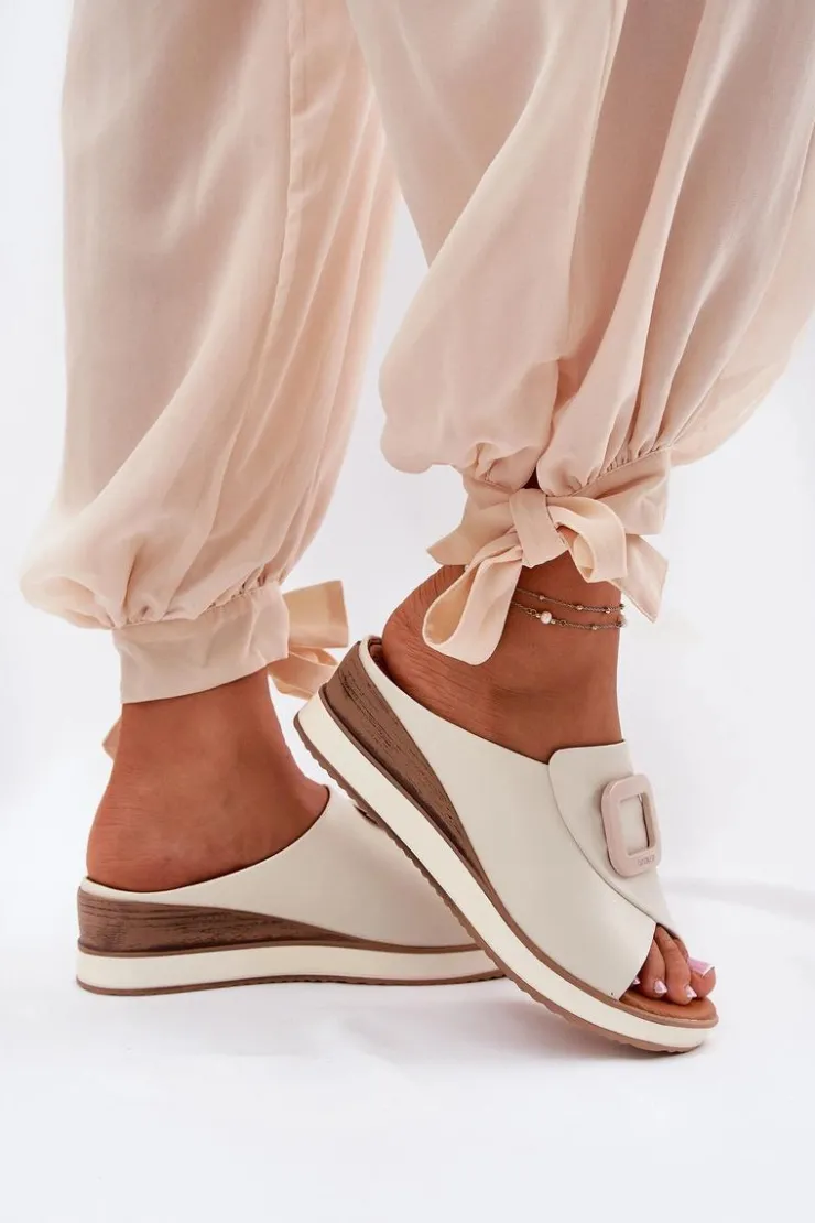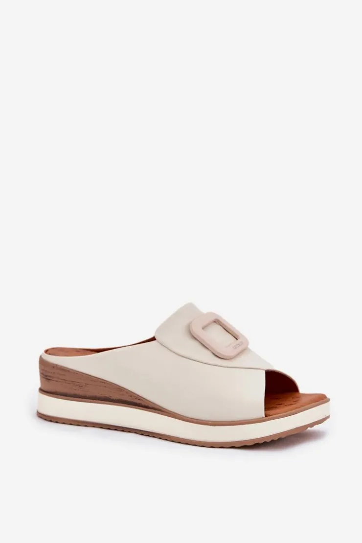 Damskie klapki wykonane z naturalnej skóry to elegancka propozycja na cieplejsze dni. Osadzone na koturnie, zapewniają stabilność i wygodę przez cały dzień. Z przodu butów znajduje się subtelny ozdobny detal, który nadaje im wyjątkowego charakteru. Miękka wkładka dba o komfort noszenia, a stylowy fason sprawia, że klapki będą doskonałym uzupełnieniem letnich stylizacji. Przy wyborze rozmiaru prosimy sugerować się tabelą rozmiarów.